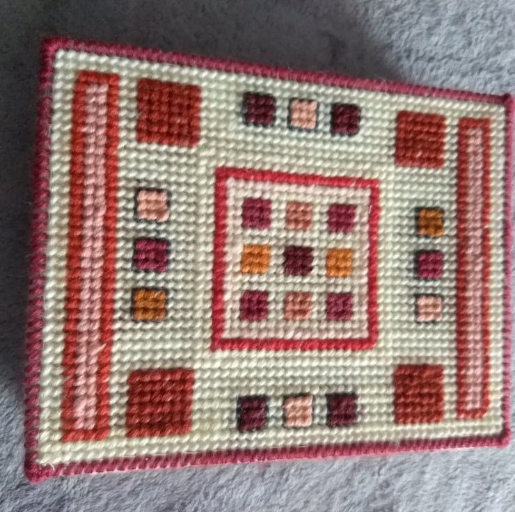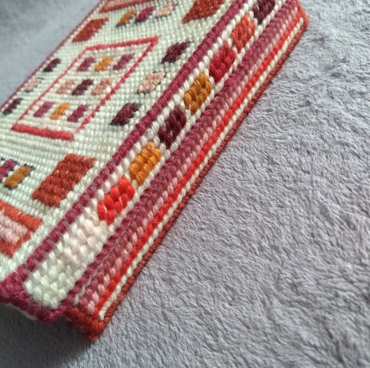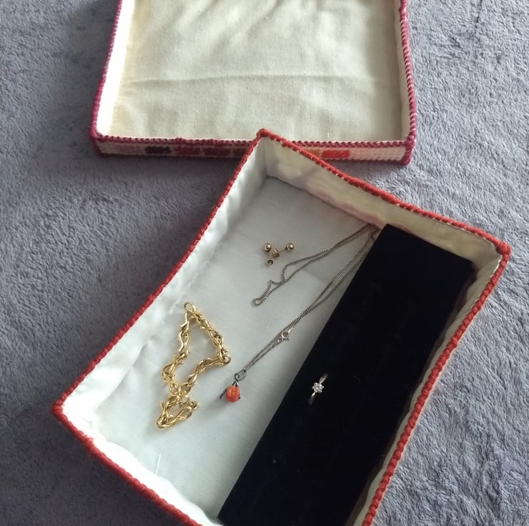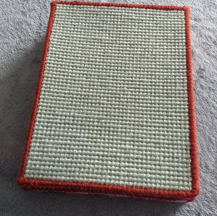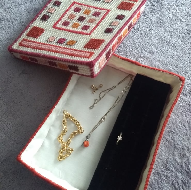 This is a tapestry jewellery box stitched by hand and completely unique. The box is made from plastic canvas and stitched with tapestry wool and is lined with calico fabric. Inside the box is a foam insert for rings the other half is left plain for other jewellery. The box measures 20 x 15 x 4.5cm. Contents not included.