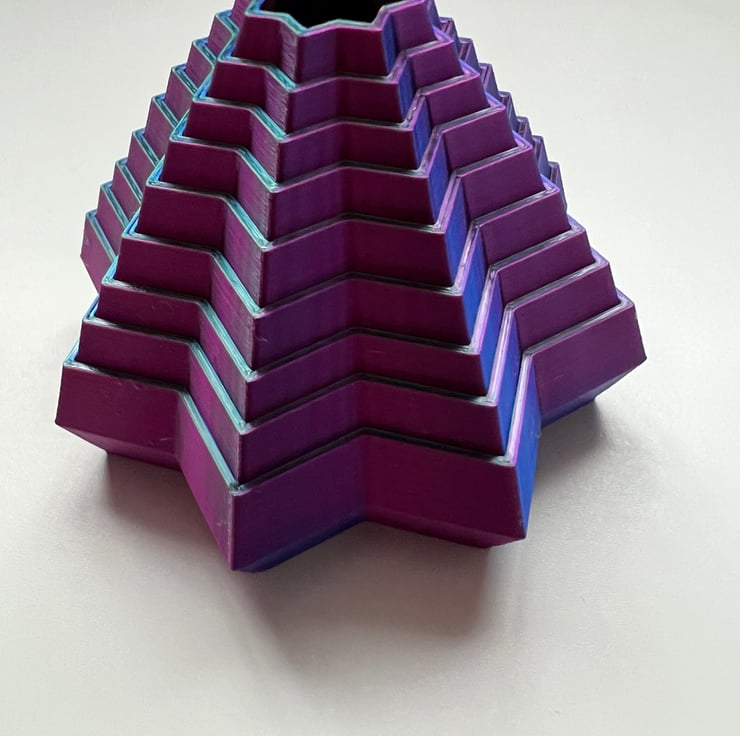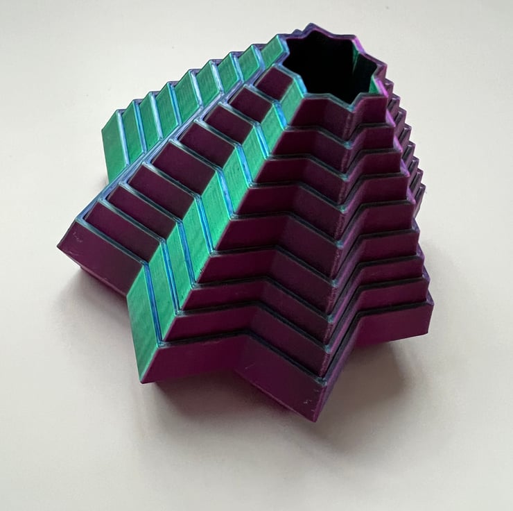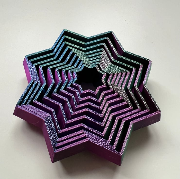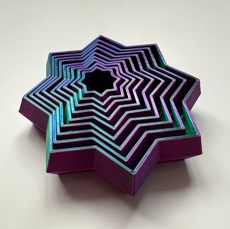 A 3D printed fidget star printed in a beautiful eye catching purple, blue and green colour.