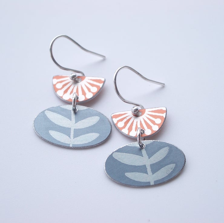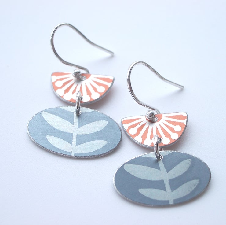 These tulip shaped folk art style flower and leaf earrings are made from anodised aluminium which I have dyed in burnt orange and grey and printed with a leaf print. The dye is made permanent by heating the aluminium. I have cut out the semi-circle and pod shape with a piercing saw and filed the edges for a nice smooth finish. The two pieces are linked with a sterling silver hoop and dangle from a sterling silver ear wire. The semi-circle and pod shape together both measure approximately 25mm from top to bottom and the widest part of the pod measures 20mm across