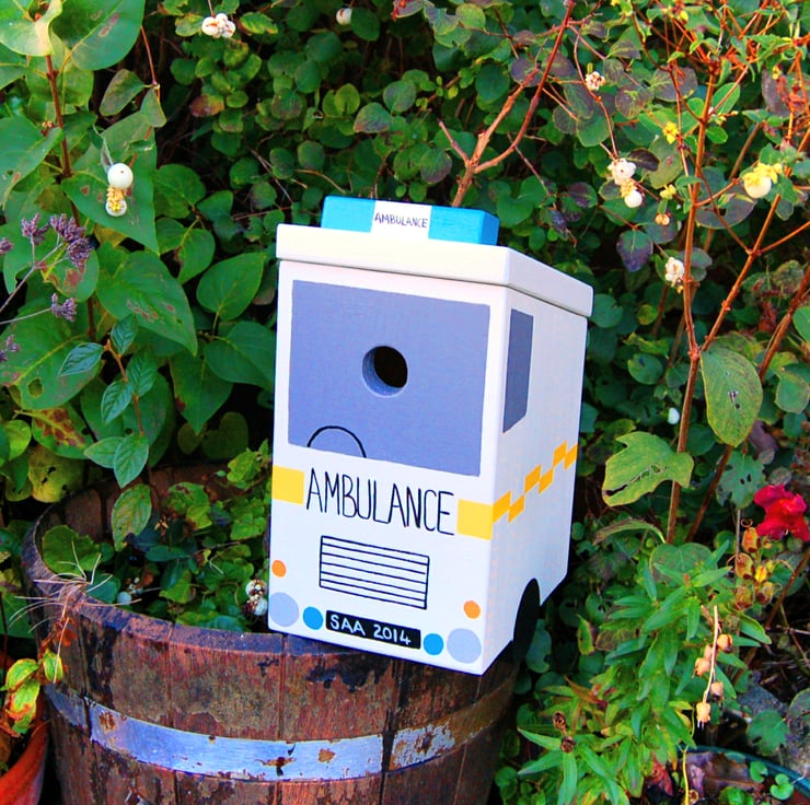 The handmade ambulance bird box measures approximately 31cm (h) x 18cm (d) x 14 cm (w).