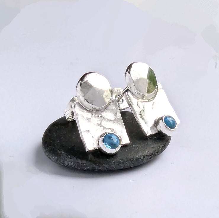 Hammered flat pebble top on a 6 mm dimple textured sqaure and embelished at the bottom with little 3 mm blue topaz.