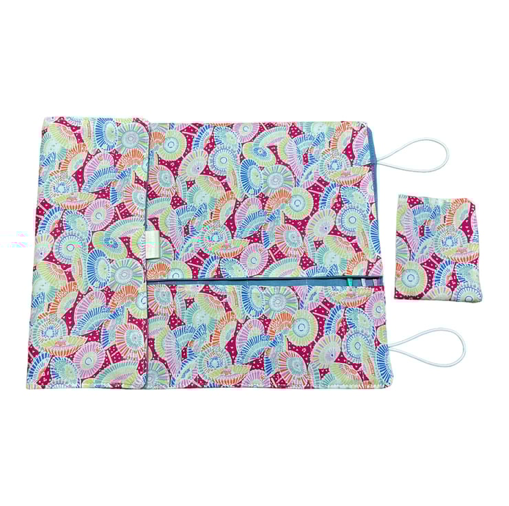 To the left of the needle slots is a large full height zip pocket to store your cables and notions. Also with this case is a cute fully lined Hook and loop tape closing pouch, that can hold all your stoppers and keys etc. The case neatly folds into 3 ( as demonstrated in the last 3 photos) and fastens with 2 strong elastic loops and natural wood buttons. contents not included