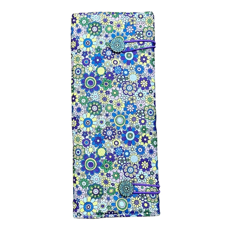 To the left of the needle slots is a large full height zip pocket to store your cables and notions. Also with this case is a cute fully lined Hook and loop tape closing pouch, that can hold all your stoppers and keys etc. The case neatly folds into 3 ( as demonstrated in the last 3 photos) and fastens with 2 strong elastic loops and natural wood buttons. contents not included