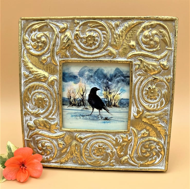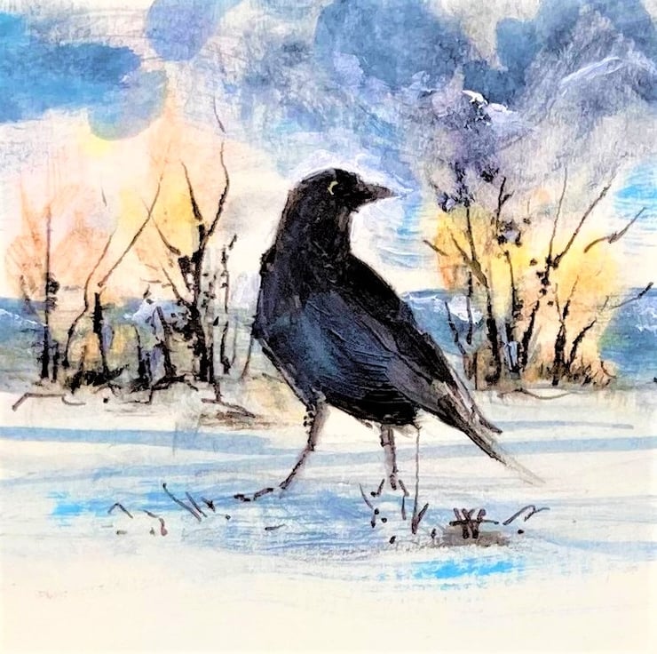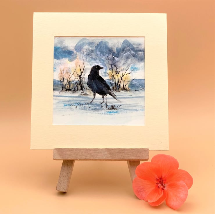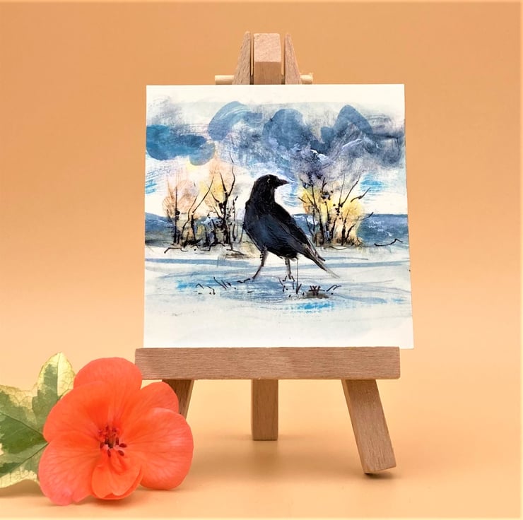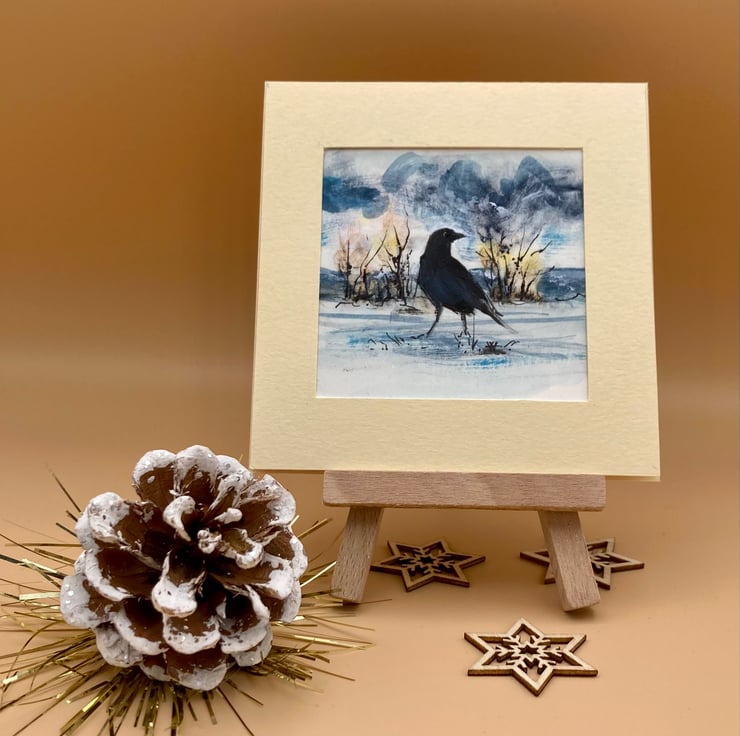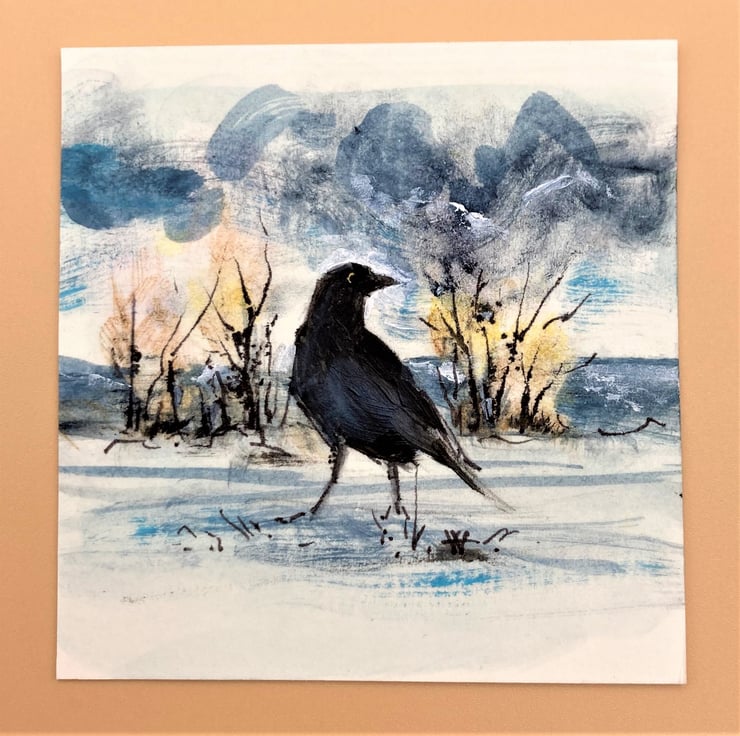 This small original painting of a black crow bird in a winter landscape is painted in acrylic, watercolour and ink on 300gm watercolour paper (all materials are professional artist quality). Crows are wonderfully clever birds and often feature as characters in myths & legends. I think this painting catches their determined personality. The painting is signed and dated. It would make a lovely 'winter birthday' or Christmas gift.