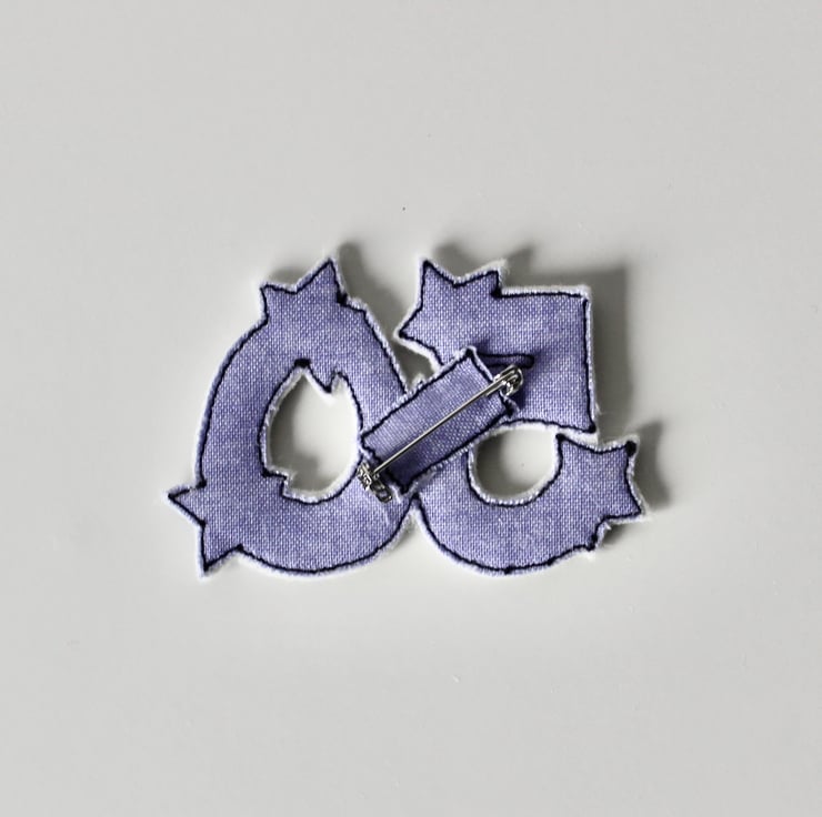 Birthday brooches are sewn using cotton cloth, 100% wool felt, glitter cloth and free hand machine embroidery; multiple layers of cloth are sewn together and cut out by hand using sharp scissors. The pins on the back are attached with hot glue, with a sewn fabric rectangle to secure.