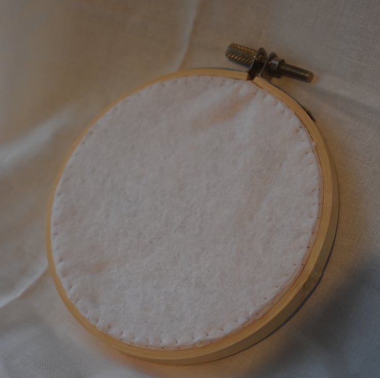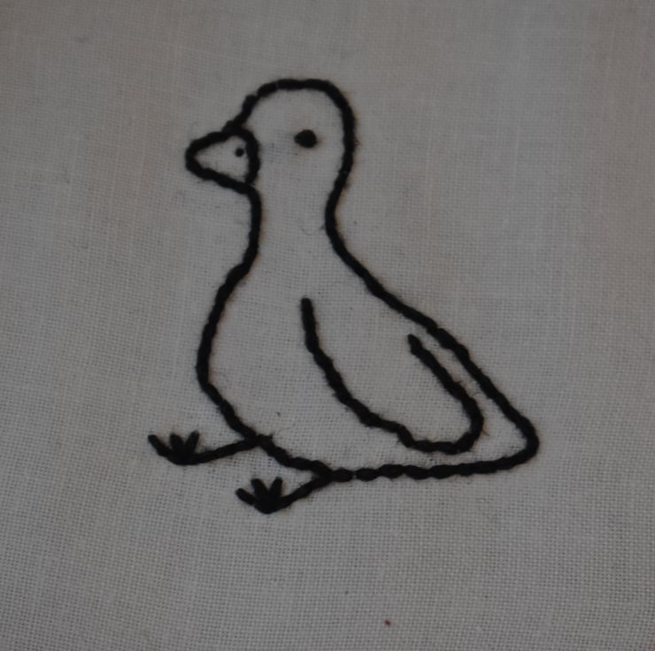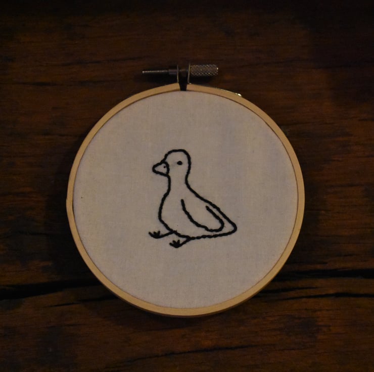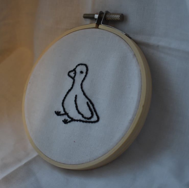 Black cotton thread embroidered duck on white cotton fabric with white felt backing in 4" diameter wooden embroidery hoop. Perfect for hanging on a wall to remind yourself even ducks get fed up sometimes.