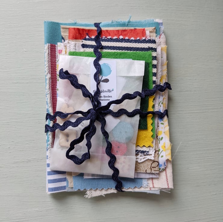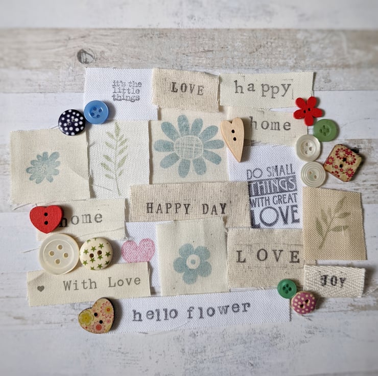 A collection of mixed fabric pieces with trim, buttons and hand stamped snippets and happy words.