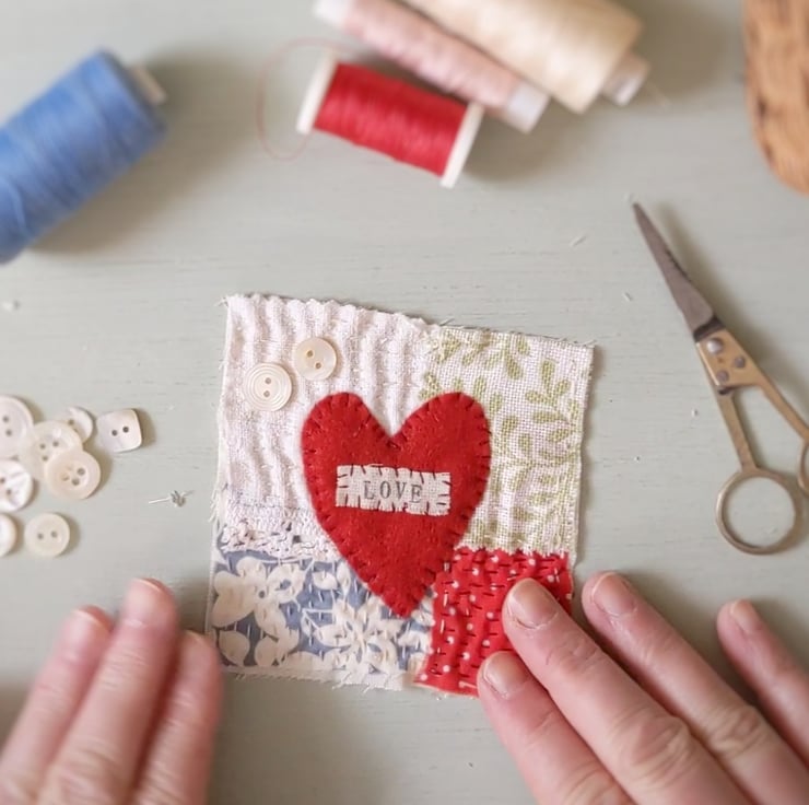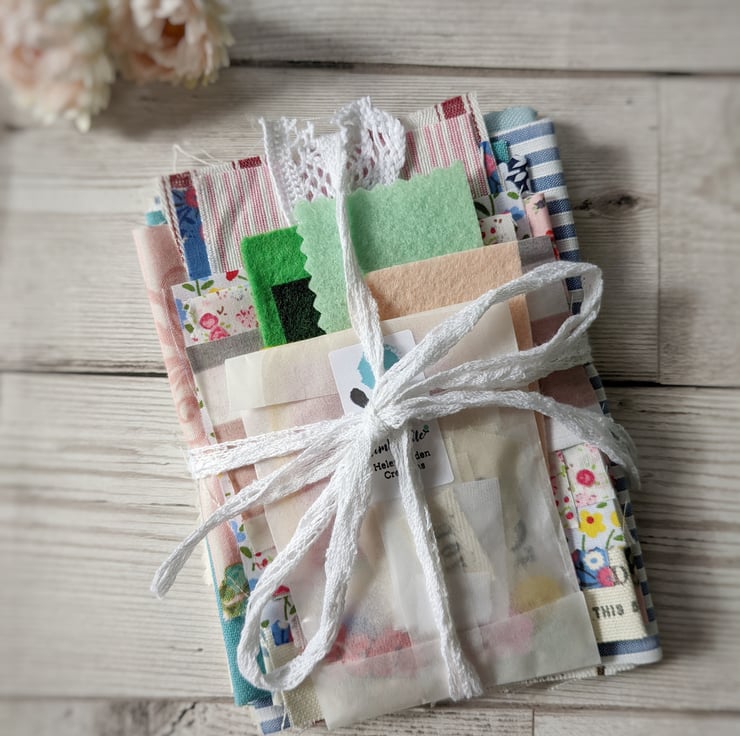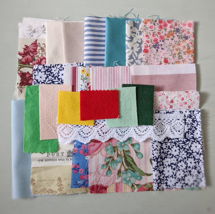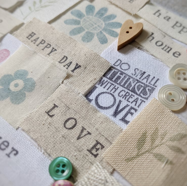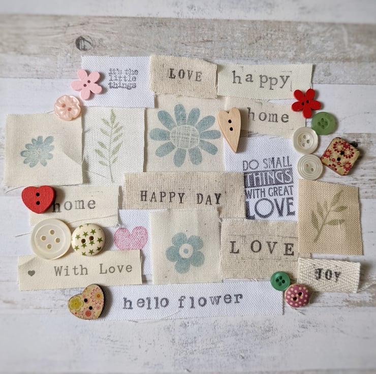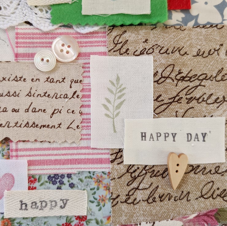 A collection of mixed fabric pieces with trim, buttons and hand stamped snippets and happy words.