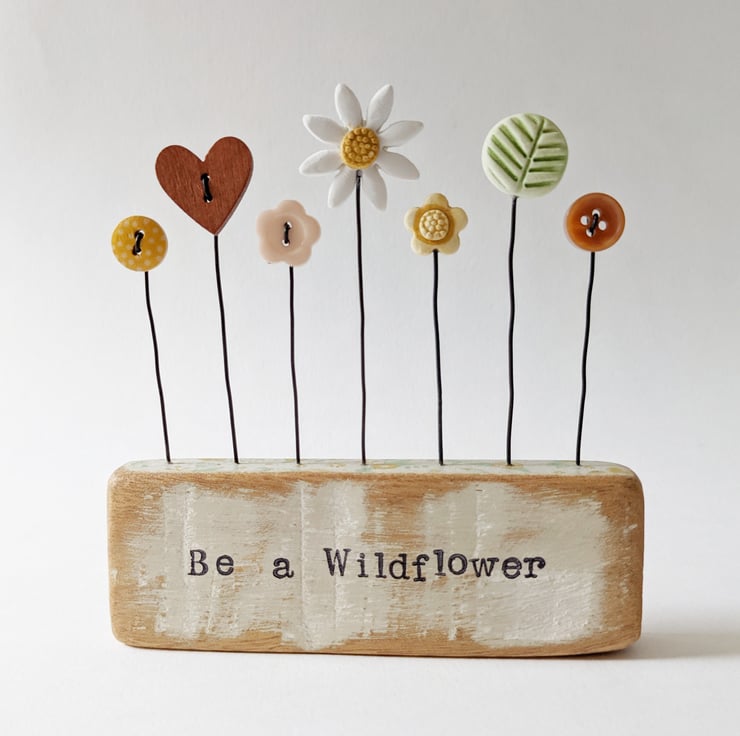 Button flowers grow in a row in this little garden with a clay leaf and flowers. They stand on their wire stalks in a wooden block with a decoupaged floral top.