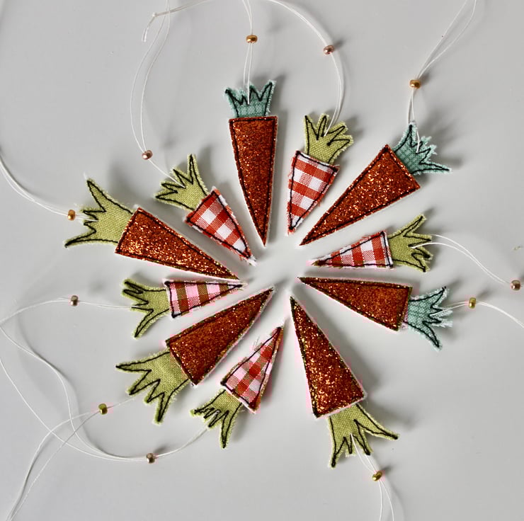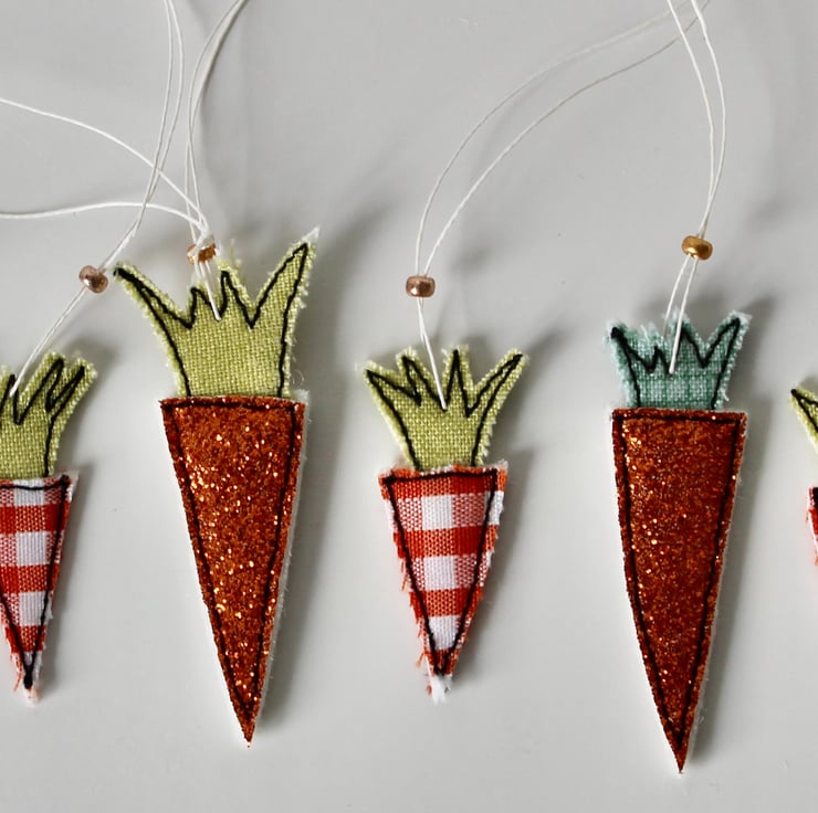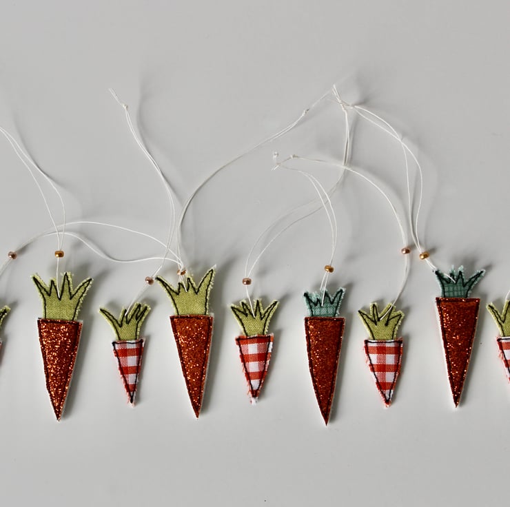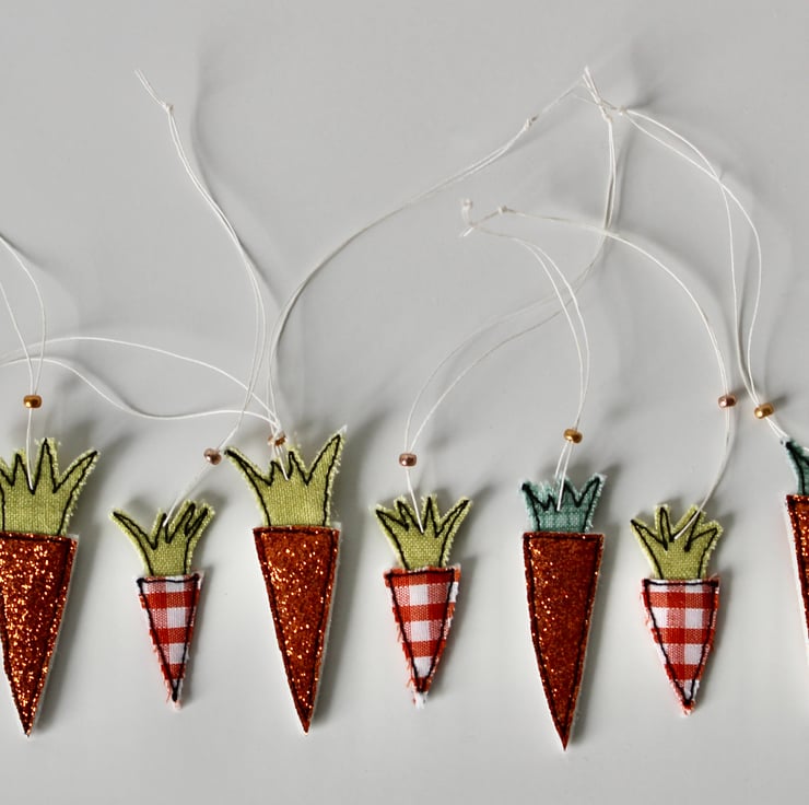 Each carrot is created using multiple layers of cloth, sewn using freehand machine embroidery and then cut out by hand. There is a linen thread to hang and a metallic glass bead to finish.