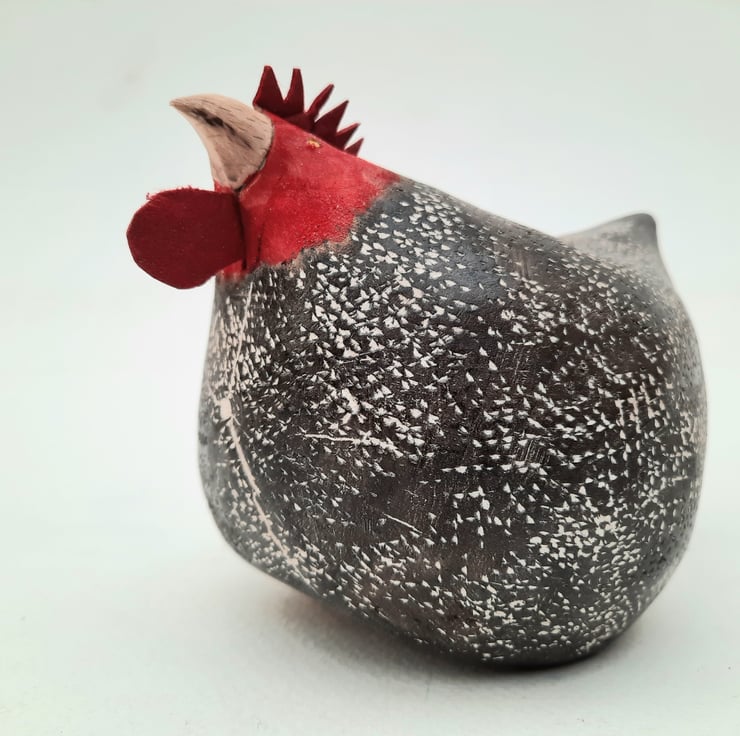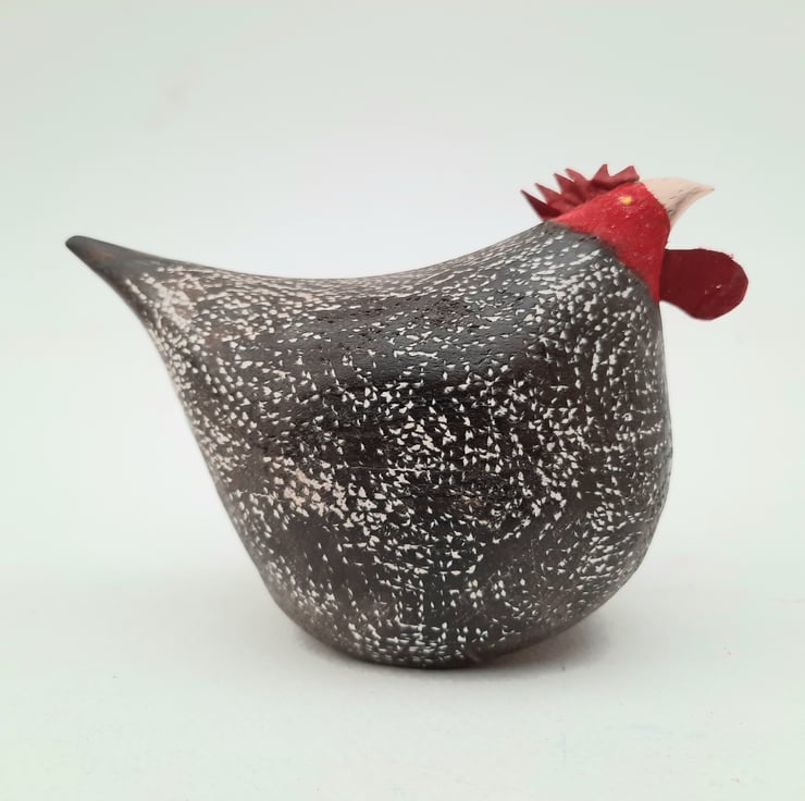Speckled chicken in sycamore 11 cms breast to vent 15 cms beak to tail.