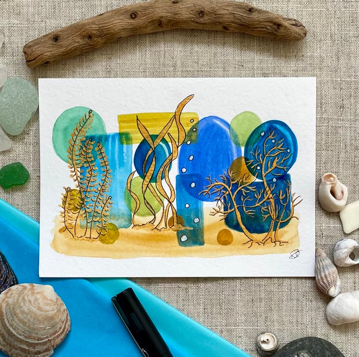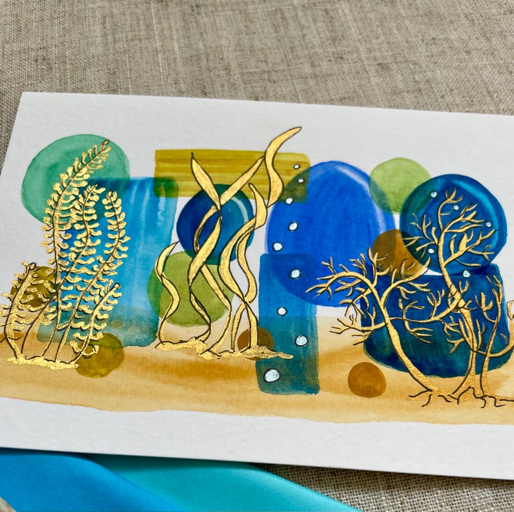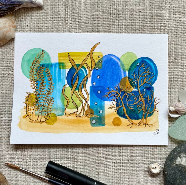 Featuring beautiful blues and greens to represent the colours of the sea, with golden fronds of seaweed painted in gold watercolour paint and black ink.