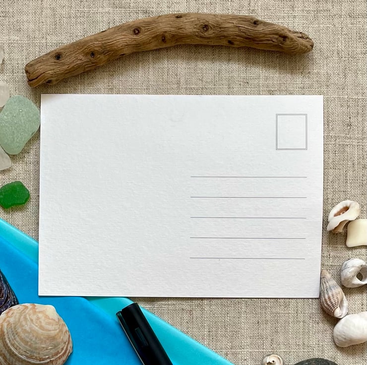 Standard postcard size of 6 x 4 inches approximately, I will post out in a compostable bag and a card backed envelope for protection.