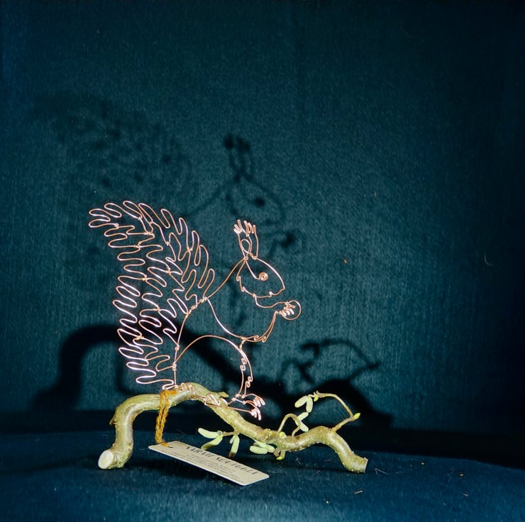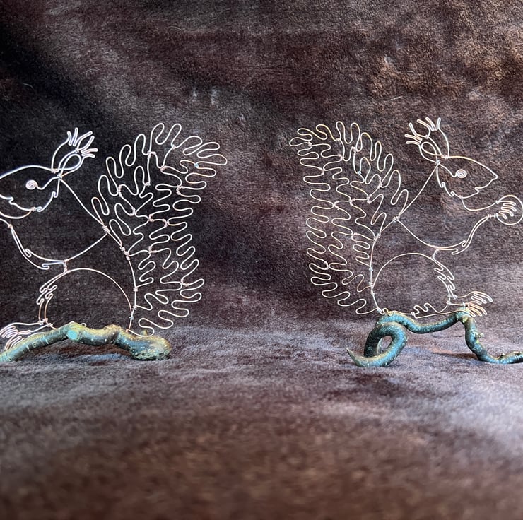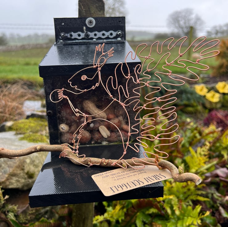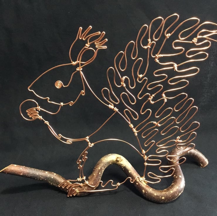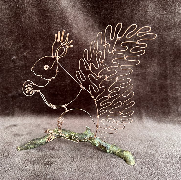 Hand made, Copper coloured wire red squirrel sculpture suitable for indoors or outdoors. Free standing, mounted on a hazel twig. She will glisten in the sunshine, cast shadows on the wall, brighten up a shelf or sit on your favourite dresser.