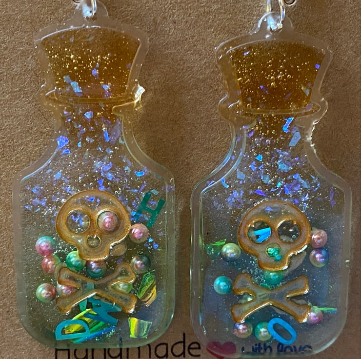 This is a fun pair of handmade poison bottle earrings. The bottle is shiny green with small pink and green beads. The skull and cross bones are painted in gold. The hook is made from Sterling silver. They are posted via Royal Mail 2nd class mail.