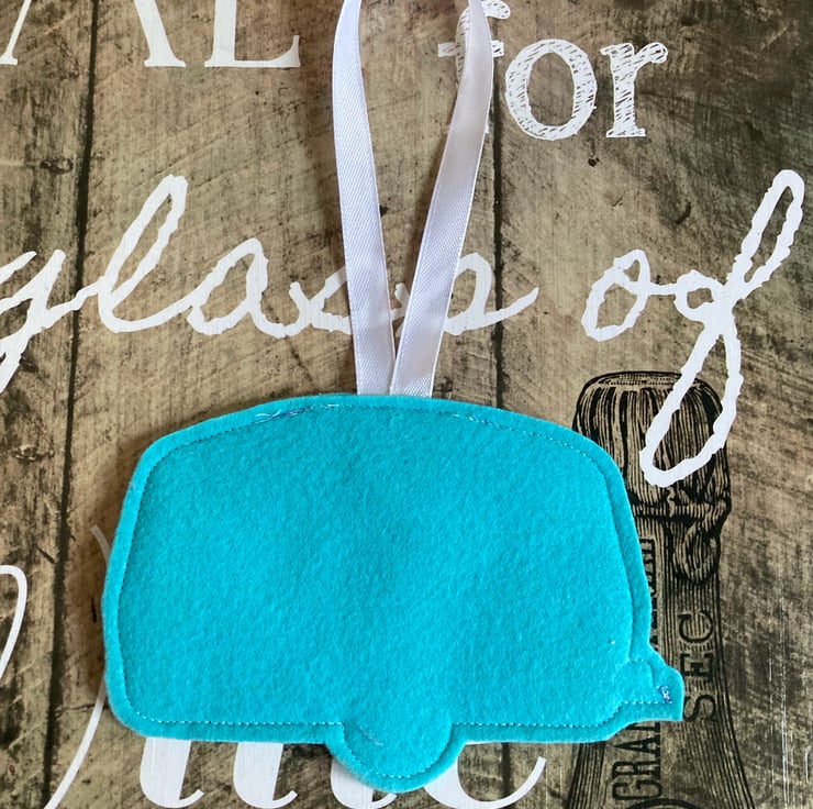 Made with cheerful turquoise felt and seaside theme fabric. In a 80s design era of caravanning.