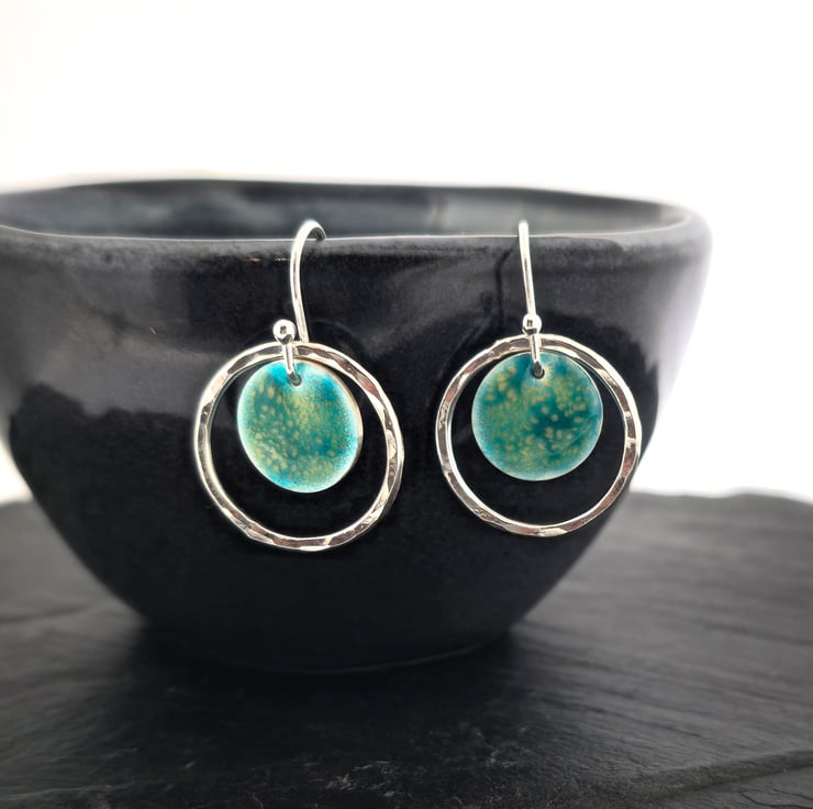 Indulge in the beautiful elegance of these solid silver and turquoise Nebula Circle drop earrings. Handcrafted with meticulous attention to detail, these earrings showcase a harmonious blend of solid silver and enchanting turquoise enamel.