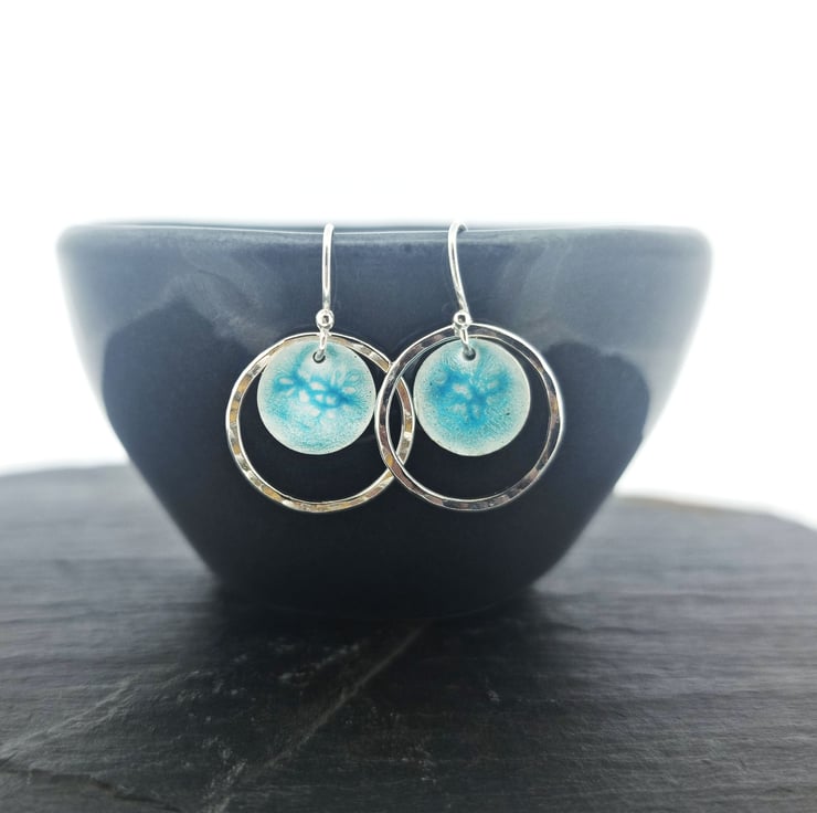 Measuring approximately 20mm in diameter, the earrings feature a central silver disk adorned with a gorgeous turquoise enamel pattern. The earrings have a drop length of 30mm, creating a graceful and eye-catching silhouette that effortlessly enhances your natural beauty.