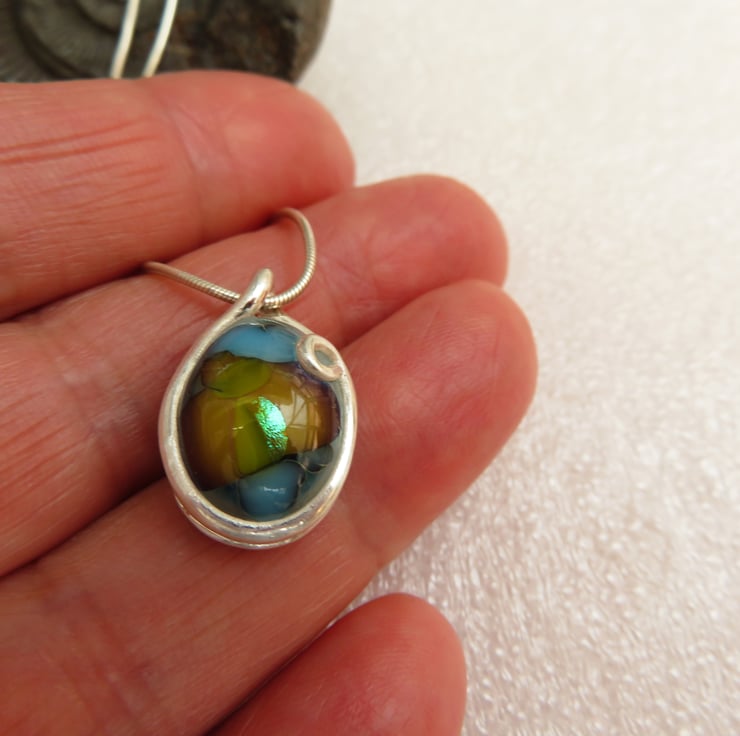 This elegant pendant has a fusion of sky blues and meadow greens and yellows in this beautiful fused glass cabochon which is hugged by shiny sterling silver swirl piping. This is a very elegant necklace that has plenty of sparkle and shine which would look stunning with a summery powder blue dress or with a contrasting black winter top. This is a tactile pendant with smooth edges and warm summer colours with a splash of lime from the dichroic glass I used. It has been polished by hand with a lot of love, to produce a beautiful shiny necklace just for you.