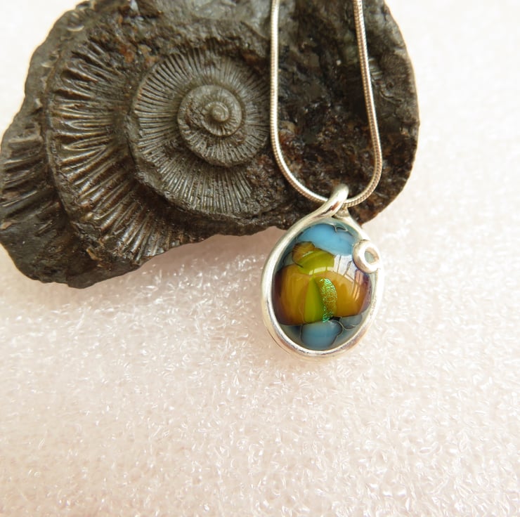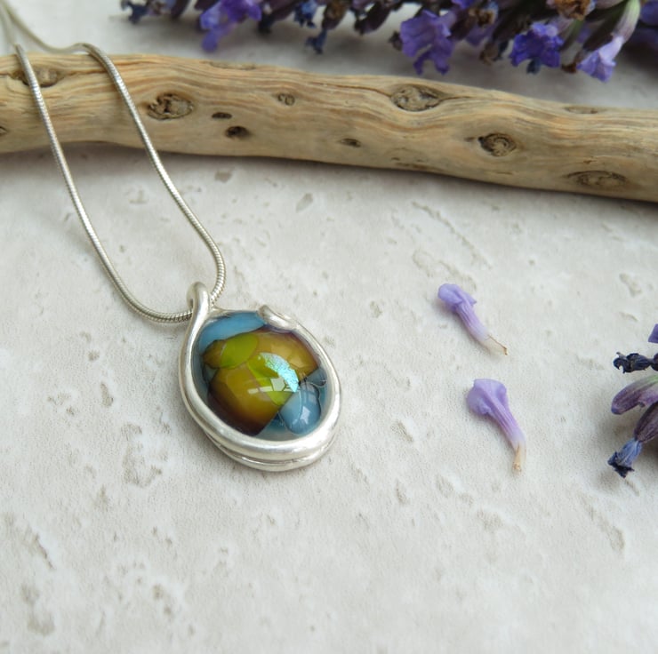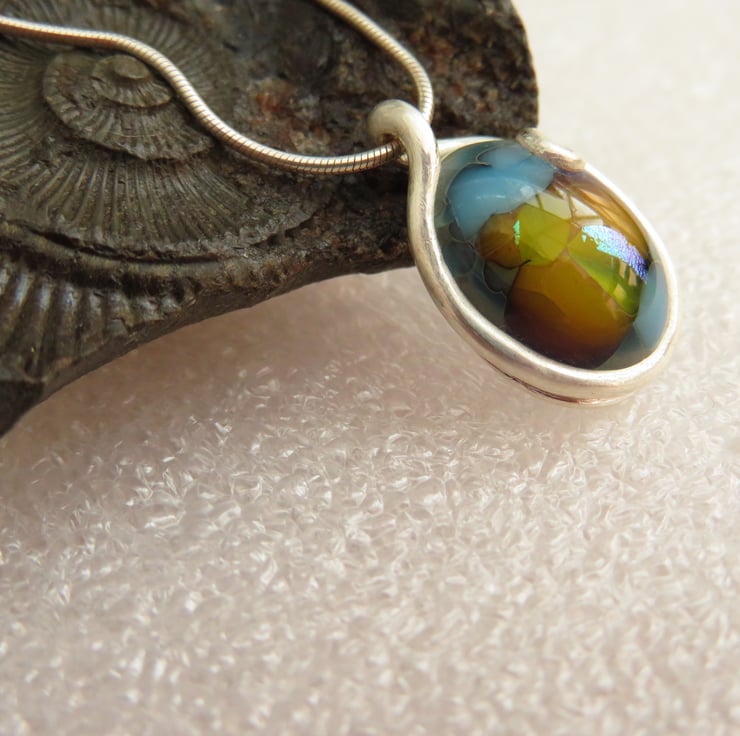 This pendant is made from silver clay, which is made from recycled silver, lovingly crafted with a fused glass cabochon before drying and fired in a kiln to produce this Sterling silver shiny pendant which is suspended from a Sterling silver snake chain.