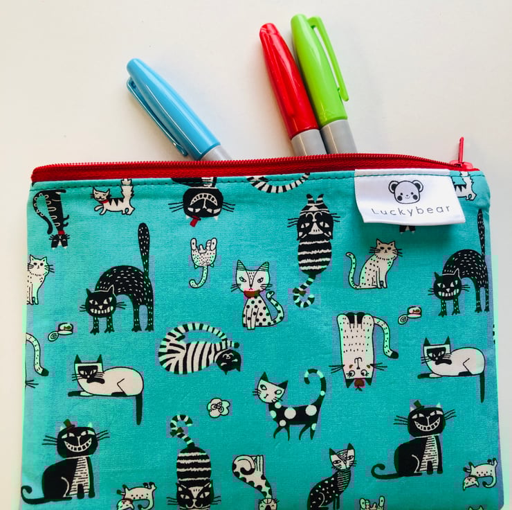 Calling all cat lovers! This charming zip pouch features a playful black and white cat print on a beautiful jade green background. It's the perfect size to hold your pens, makeup, small accessories, or anything else you want to keep organised.