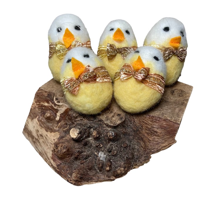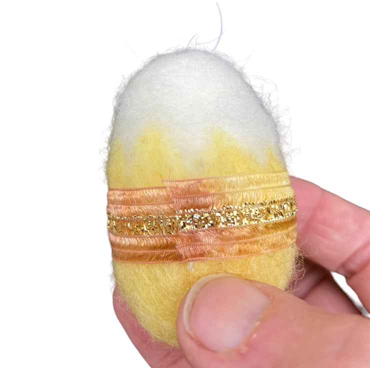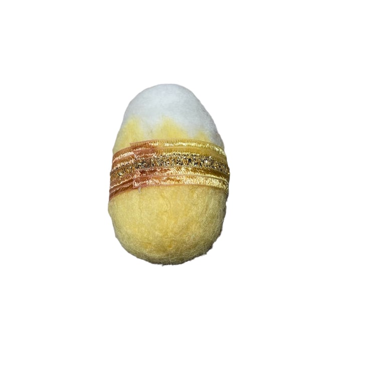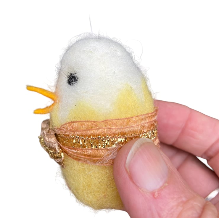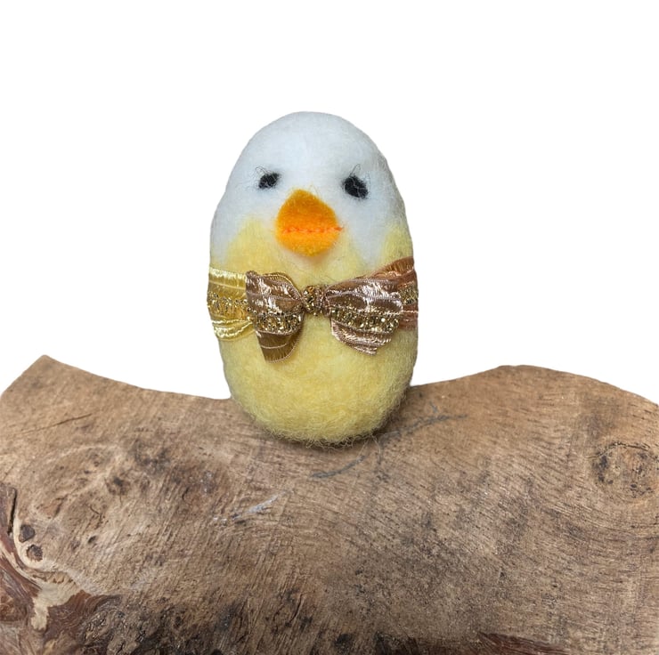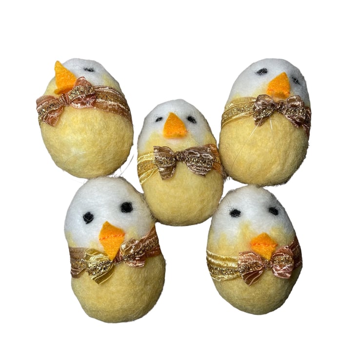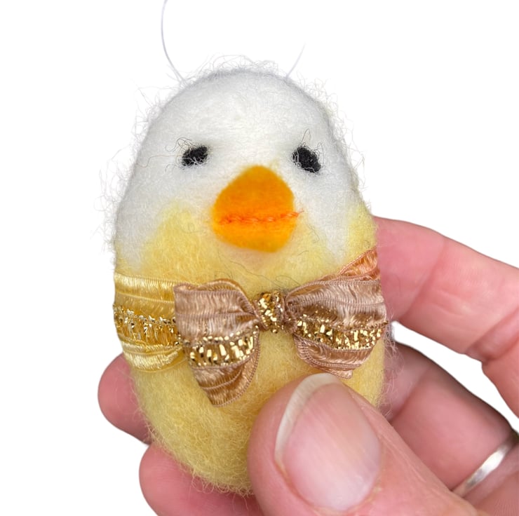 Adorable chicks in an egg shape have been needle felted using woollen fibres and a barbed felting needle. Ideal as hanging decorations for the easter tree. The chick is yellow and white in colour and made in the shape of an egg. An orange felt beak has been attached and eye needle felted in place. A sparkly golden ribbon bow has been added around the middle of the egg and a nylon loop attached to the top to facilitate hanging.