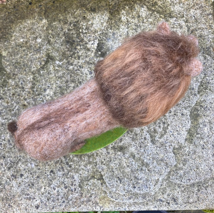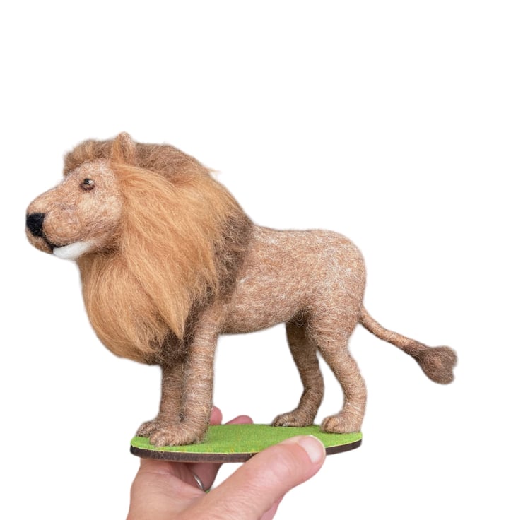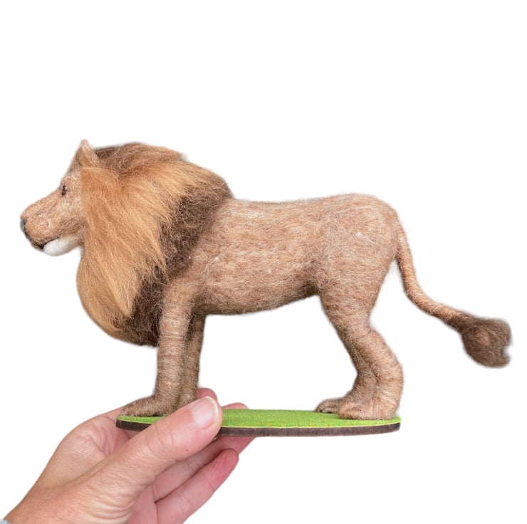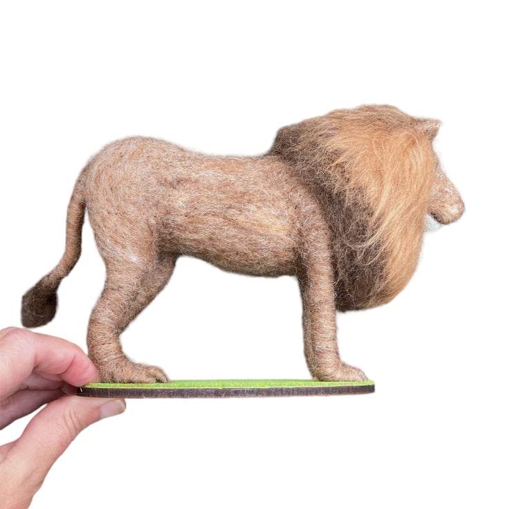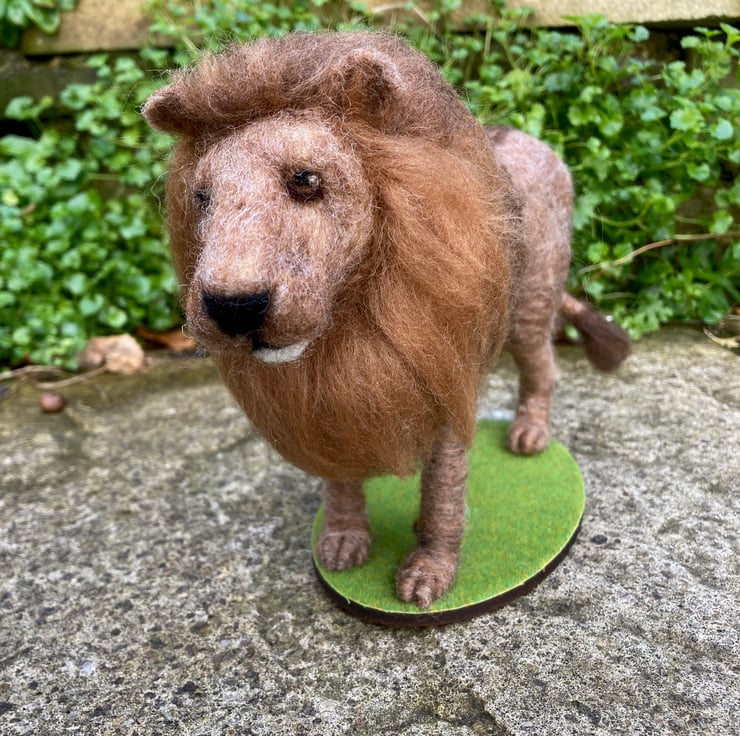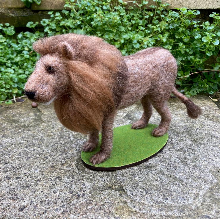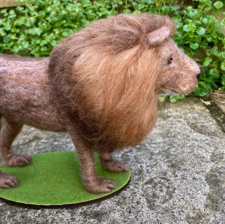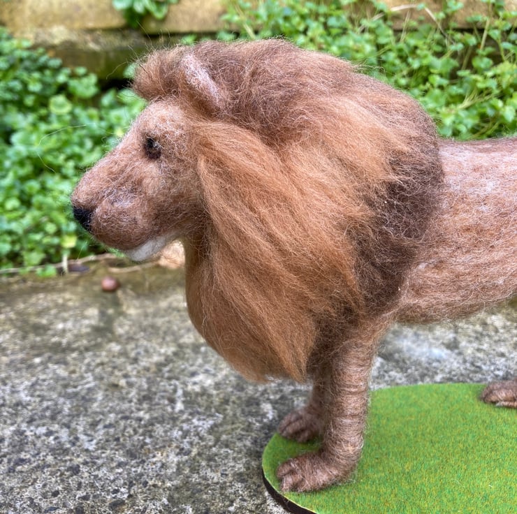 This handsome lion has been needle felted using woollen fibres and a barbed felting needle to sculpt the fibres into shape. The basic shape has been formed using core wool and then a top coat in appropriate colours has been applied and the luscious mane added. The tail is formed over wire to allow it to be gently posed. The legs have also been made over wire formers to add strength and stability and a wooden dowel has been used to aid mounting. The eyes are also needle felted. The lion has been mountedon an oval shaped piece of plywood covered in artificial grass.