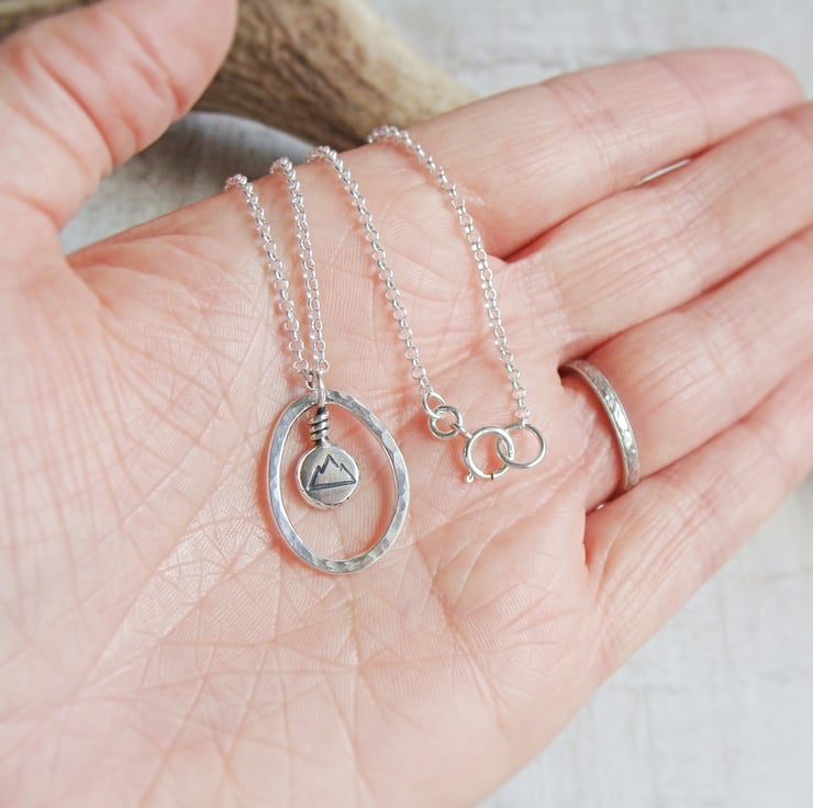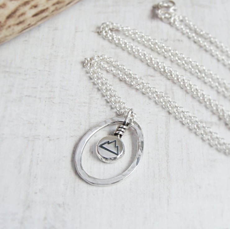 A keepsake necklace for all you adventurers, wanderers and nature lovers! A recycled sterling silver pebble stamped with my mountain design that hangs within a silver hoop in an organic pebble shape.