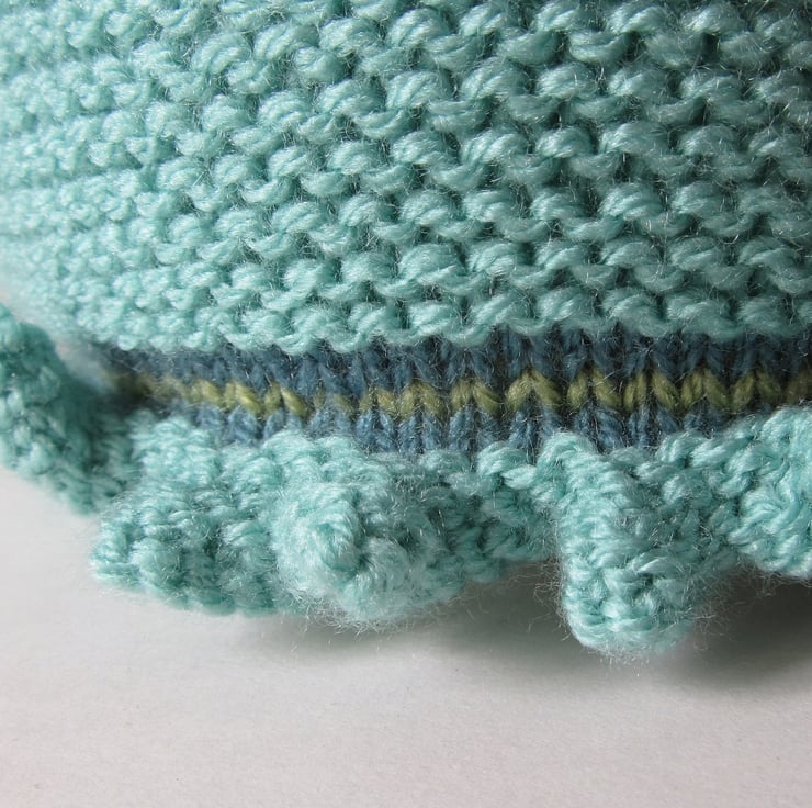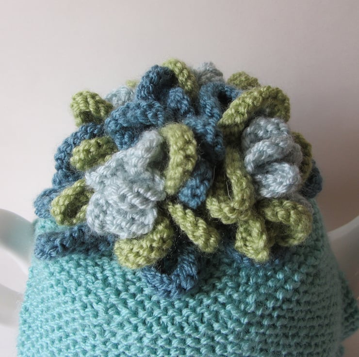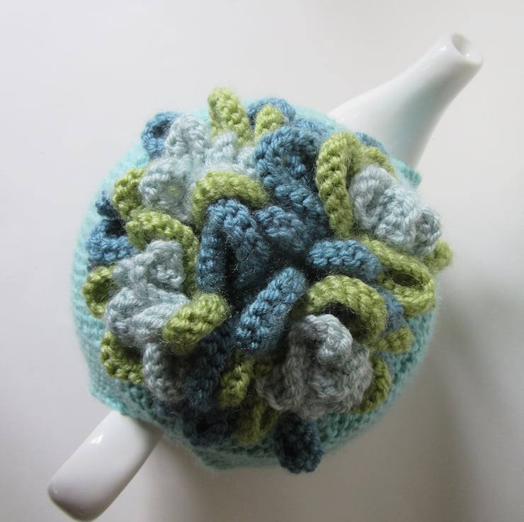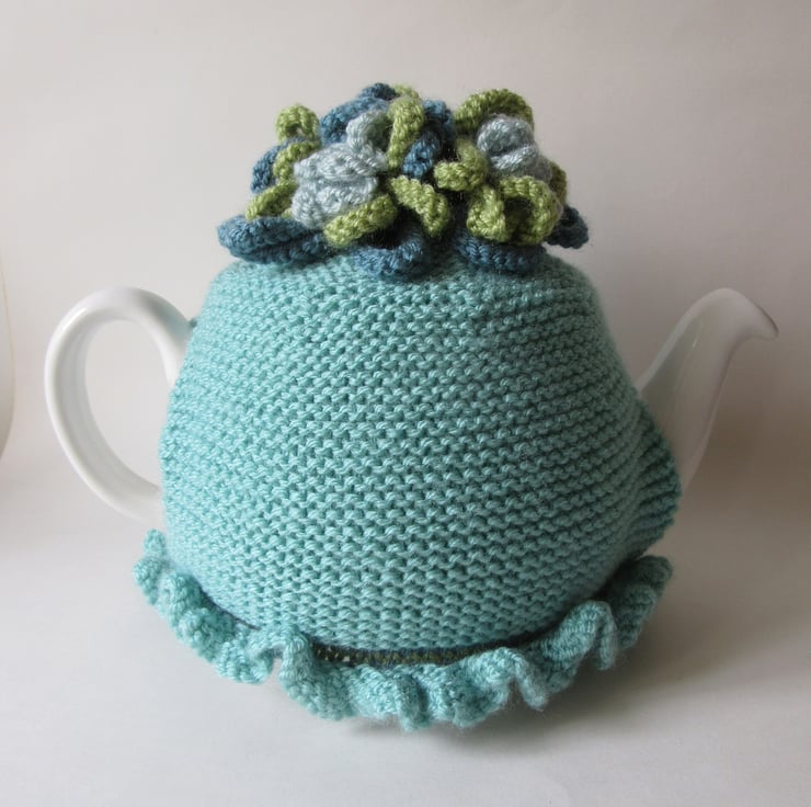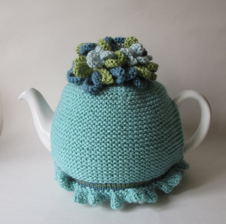 A hand knitted floral tea pot cosie using a beautiful aqua turquoise coloured yarn. The body is knitted in garter stitch, for thickness and stretchability, ensuring a good fit and yet ease for a swift removal when a 'top up' is needed. The tea pot handle peeps through the side opening so it dosnt get too hot to handle. There is a dark teal and lime green stripe along the bottom which is then all finished off with an aqua turqoise knitted frill. The cosie is topped with 4 whirly - twirly knitted flowers, the bottom set of five 'petals' knitted in dark teal, the middle set of five 'petals' knitted in lime green and the top set of five 'petals' knitted in duck egg blue to match the stripe along the bottom. A perfect house warming gift, or for yourself...... just because it looks pretty on the kitchen work top!