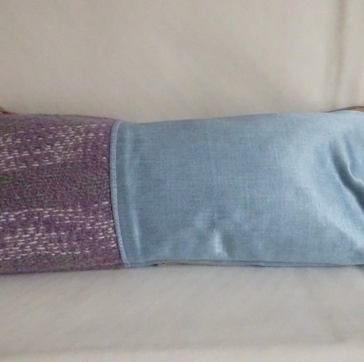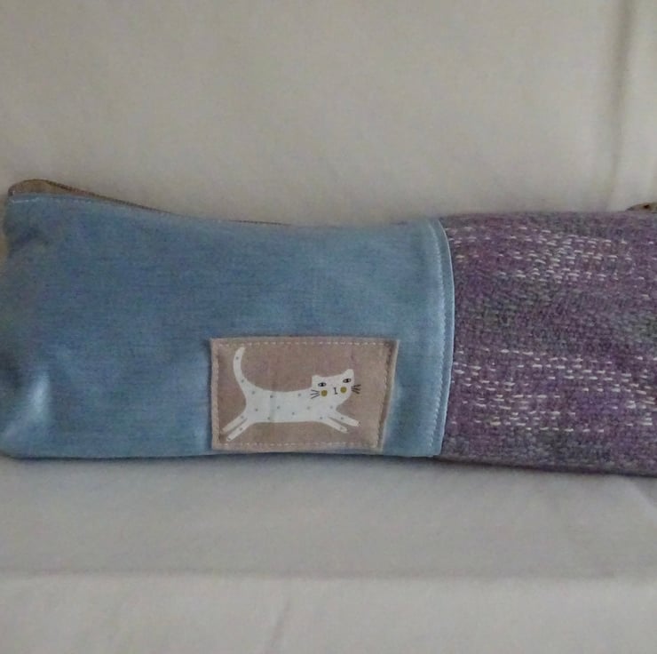 The bag is made from handwoven fabric and light blue sateen type fabric. The handwoven section is lilac, white and duck egg blue. It is lined with a delightful blue flowered polycotton print and has a zip to keep the contents secure. The bag has been hand sewn by me and incorporates some of my handwoven fabric. A cat motif is sewn on the outside of the bag to define it as part of the Weaving Cats range of items.