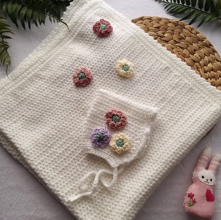 This gorgeous blanket is made from a soft baby yarn in a gentle shade of white. Appliqued with flowers in muted shades of lavender, jade, birch, oyster pink and dusky pink.