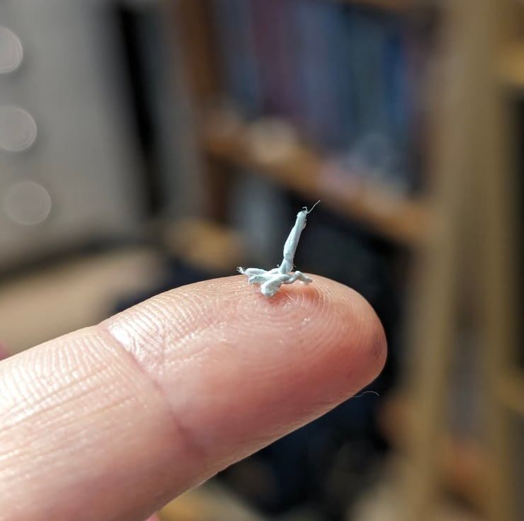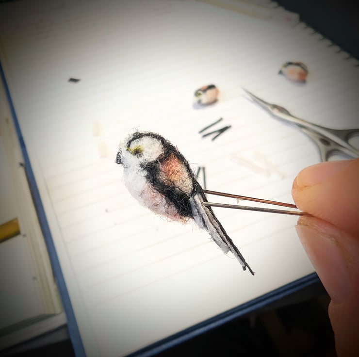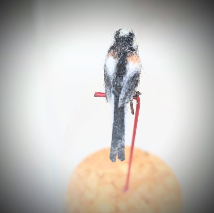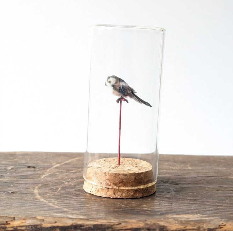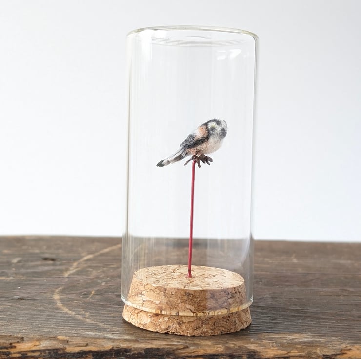I first saw these tiny little birds in a big fir tree with huge mauve coloured fir cones. I could see something fluffy and stripey, which seemed weirdly balanced as it flitted among the branches. It was of course the Long-tailed tit, who would be one of our tiniest birds except for that amazingly long tail. I love making them life-size as well as in this mini 1:4 scale, tucked tidily in their own glass jar.