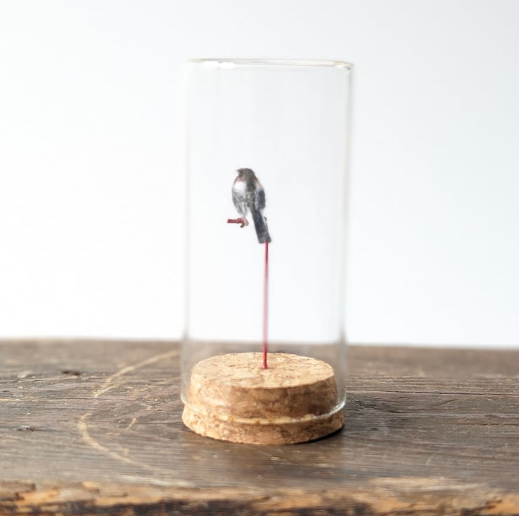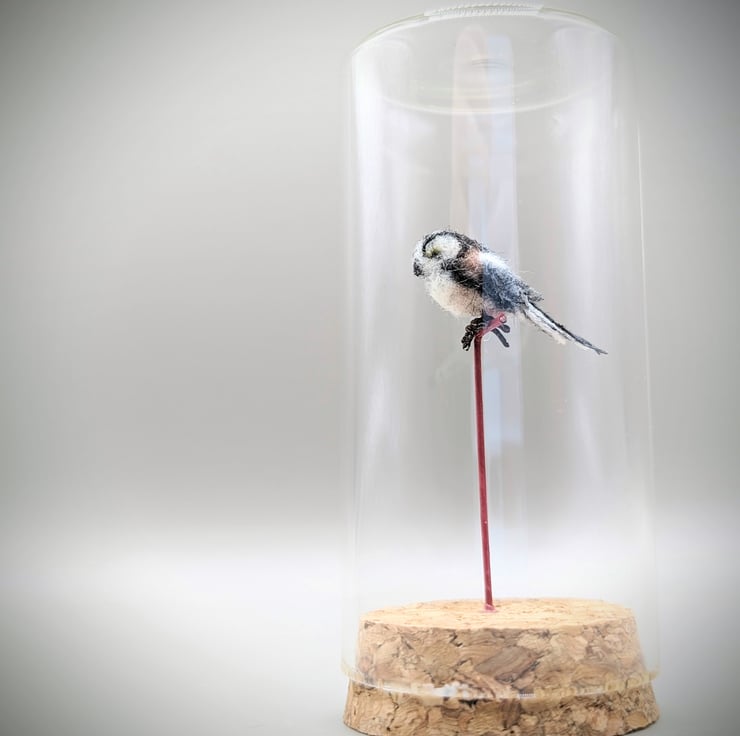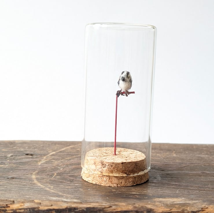 One-of-a-kind hand-made needlefelt wool Long-tailed tit perched in their own tiny glass jar wrapped with a ribbon in their own protective gift box.