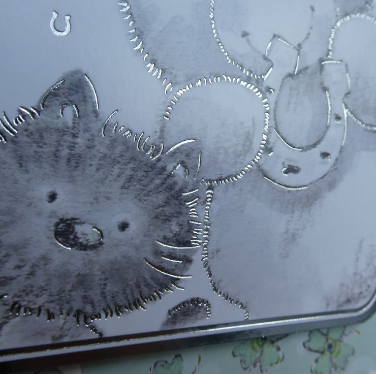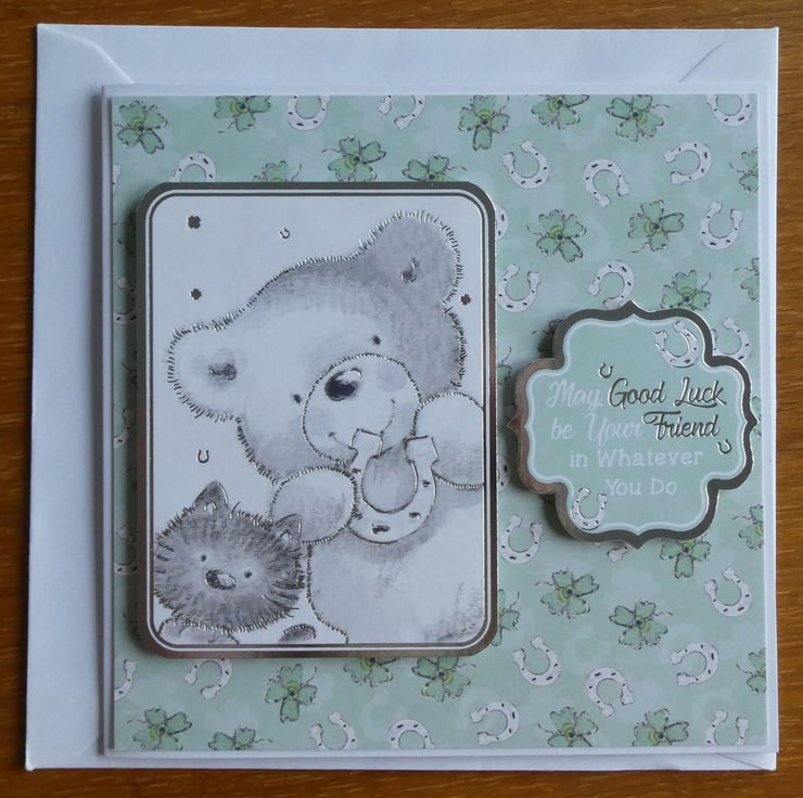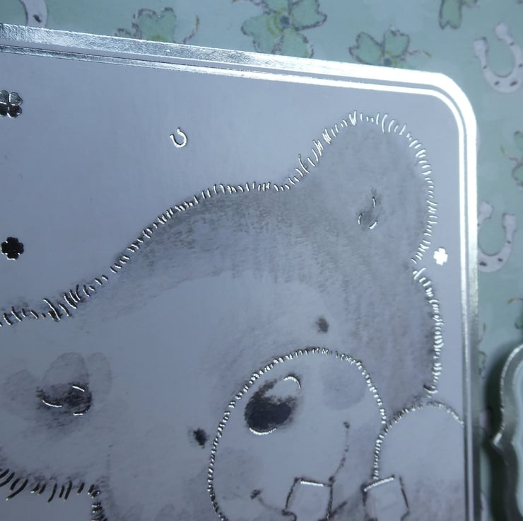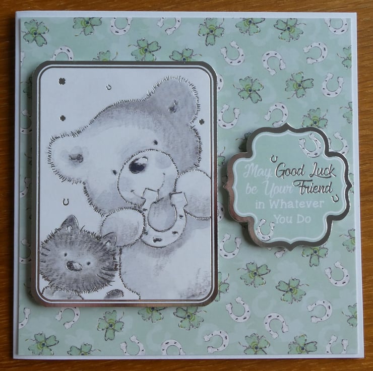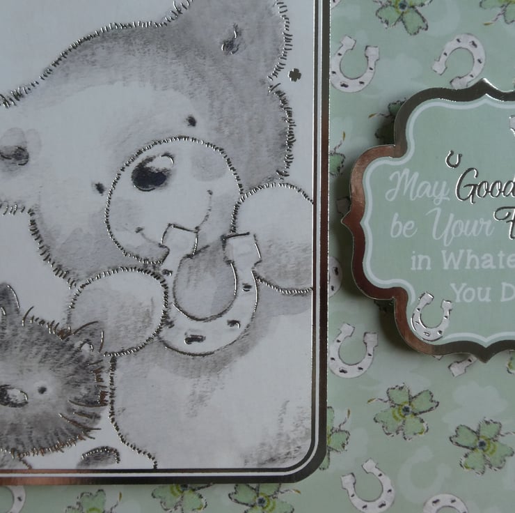 The card has a printed image of a black cat and a bear holding a horseshoe, the image is framed with a silver foiled edge and raised on foam pads from the background card patterned with four leaf clovers and horseshoes.