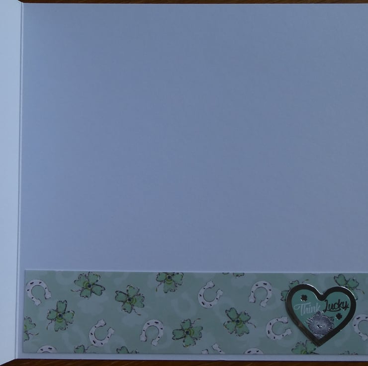 Inside the card there is a band of matching card across the bottom edge with a heart shaped message with a black cat and the words 'Think Lucky'.