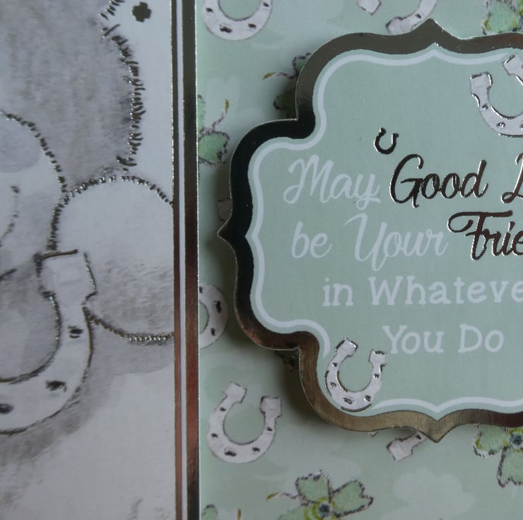In shades of green and grey, with silver foiled accents, this cute Good Luck card would be ideal to send to someone to wish them well, maybe with a test, exams, driving test or other occasions.