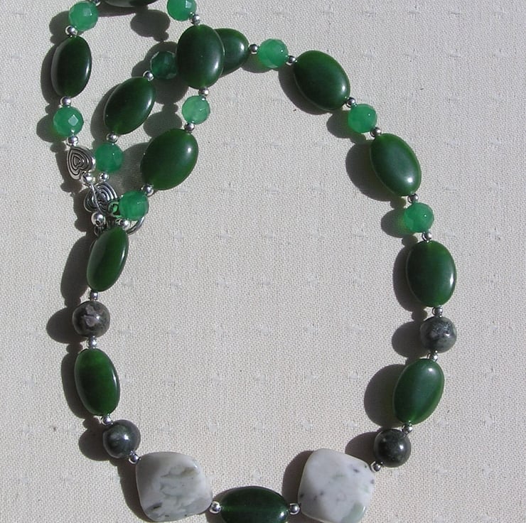 This Stunning Necklace is made wholly from Green Beads... Nephrite Jade oval beads teamed with Peace Jade - dreamy marbled diamond shaped beads along with Green Jade and Kambamba Jasper round beads, each separated by a tiny Silver spacer beads - a marvellous Celebration of the colour Green that will look stunning either worn casually or with something more Elegant for a Special Evening out