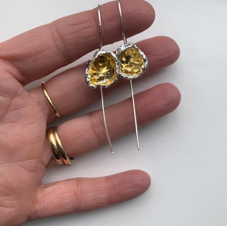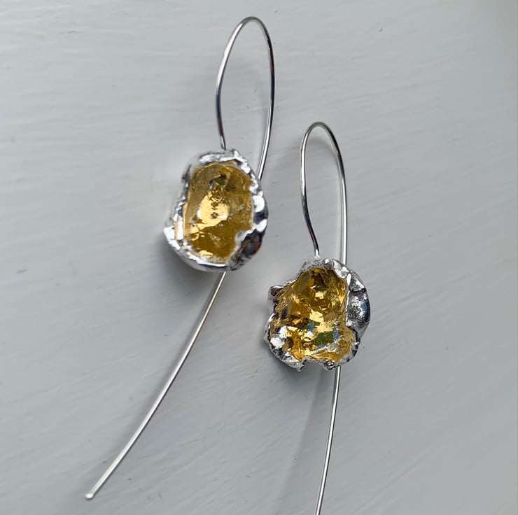 These beautiful organic shapes have been created by pouring molten silver directly into water! I have then further enhanced their bowl like form by lining with 24k gold using the ancient Korean technique of keum-boo. Their long shapely sterling silver stems make them an elegant statement piece!