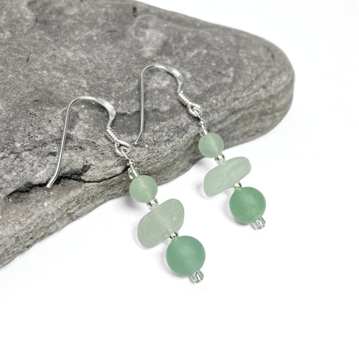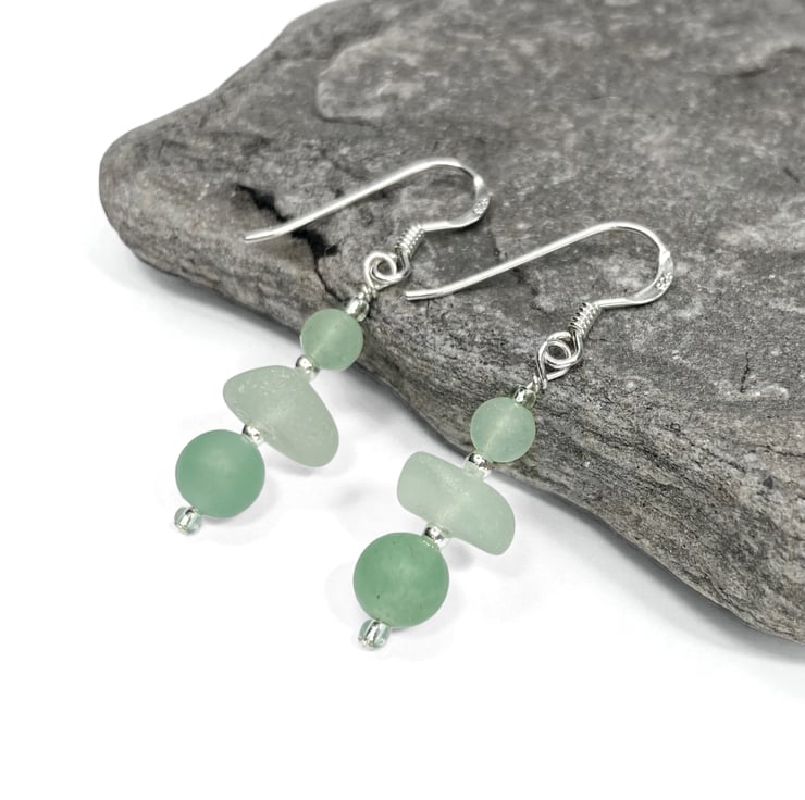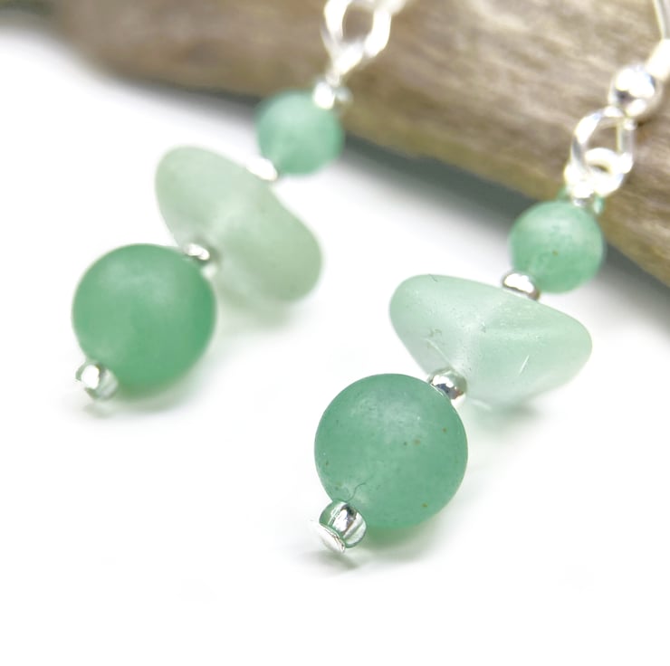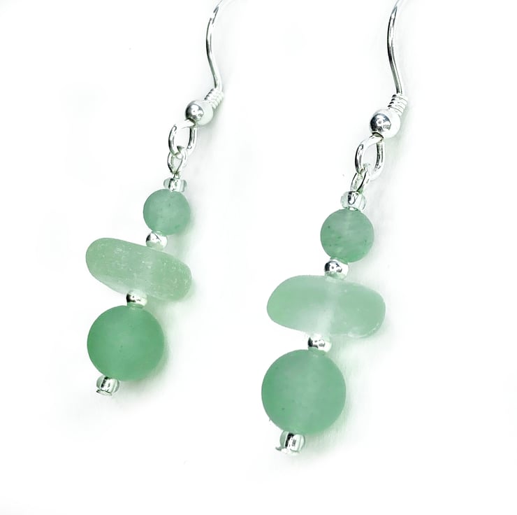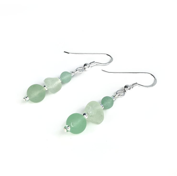 Delicate sea glass drop earrings. The earrings are handmade with aqua green Scottish beach glass, frosted Aventurine crystal beads, sterling silver beads and Czech glass beads. The earrings include nuggets of genuine sea glass, worn smooth and frosted in the Scottish sea. This pale green colour is evocatively known as 'sea foam'.
