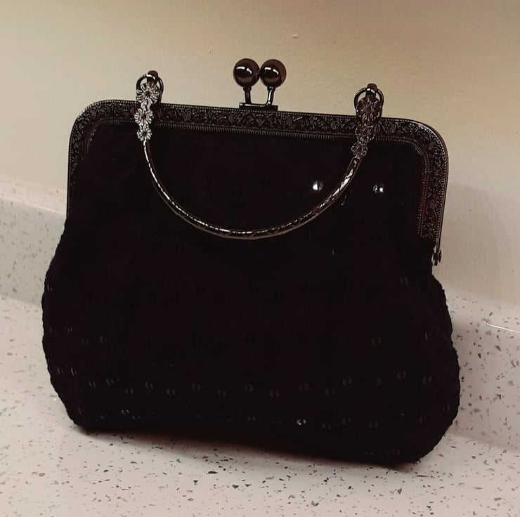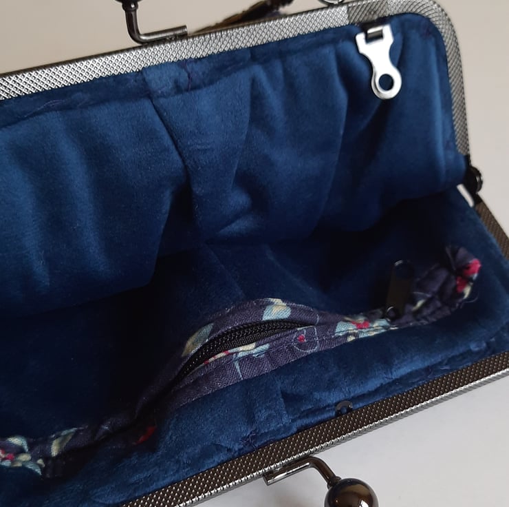 The purse clasp is a beautiful retro gunmetal colour, with a single handle.