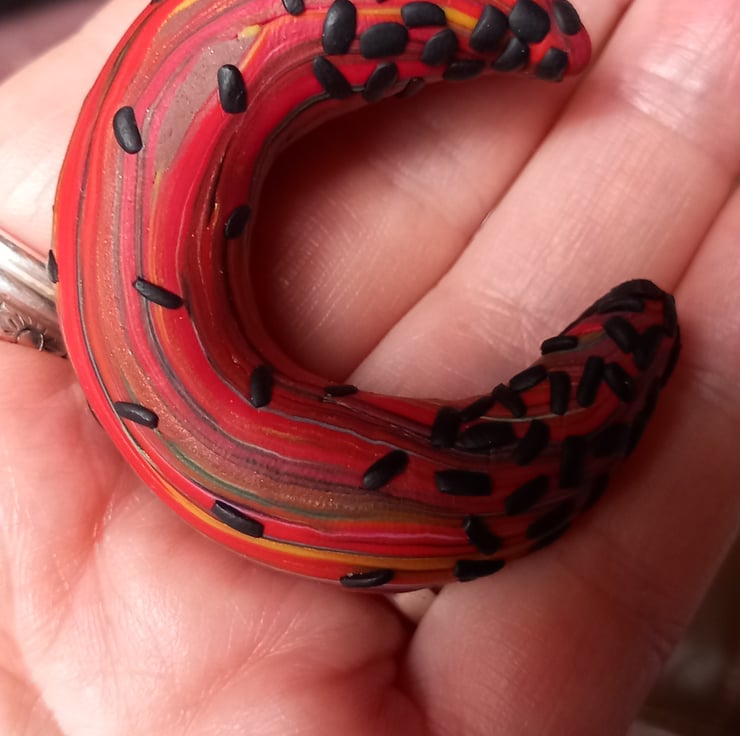 A new design from Froosh Maroosh, cosmic worms!! Polymer Clay in stripy orange's and brown's with a sprinkling of black dashes over the surface.