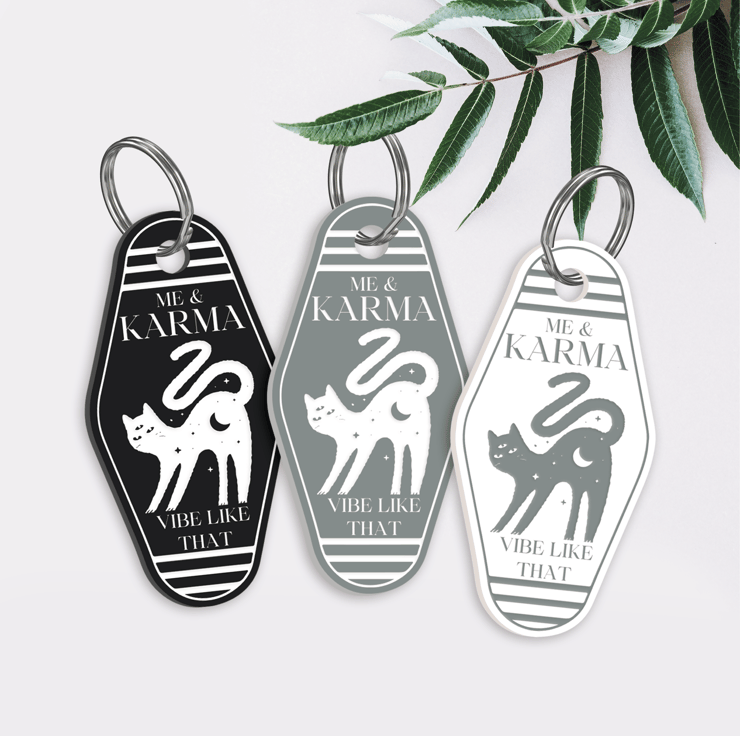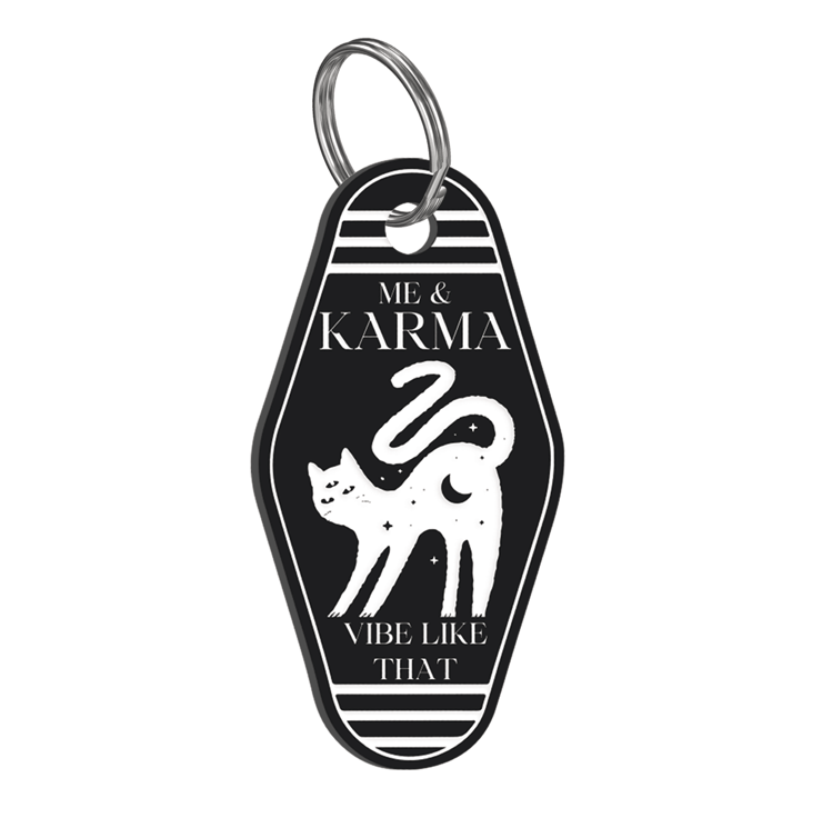 Spark up your style game with a song-inspired keychain that features the phrase "Me & Karma Vibe Like That" encased in a retro motel-style design, accompanied by an adorable cat motif. Crafted with precision and care, our keyring is not just a practical item - it's a way to let your personality and music taste shine.