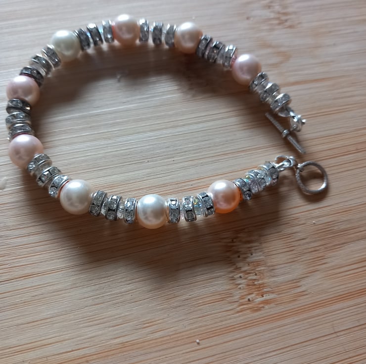 together with Austrian crystals and crystal rondelles.. The bracelet is fastened with a toggle clasp and length of bracelet is approximately 7.5 inches. If you require another size please message me. The pearls and beads are strung on stainless steel wire. All other metal used is sterling silver.