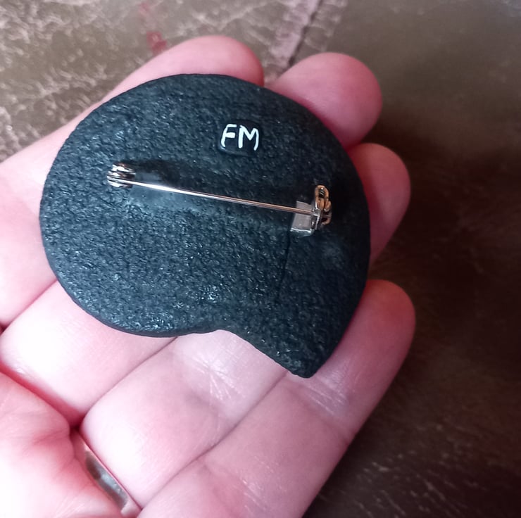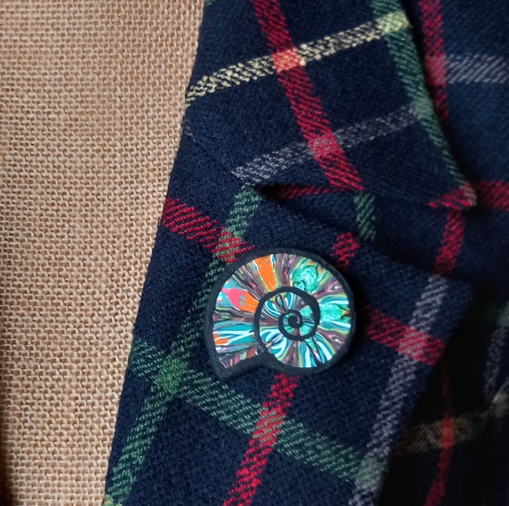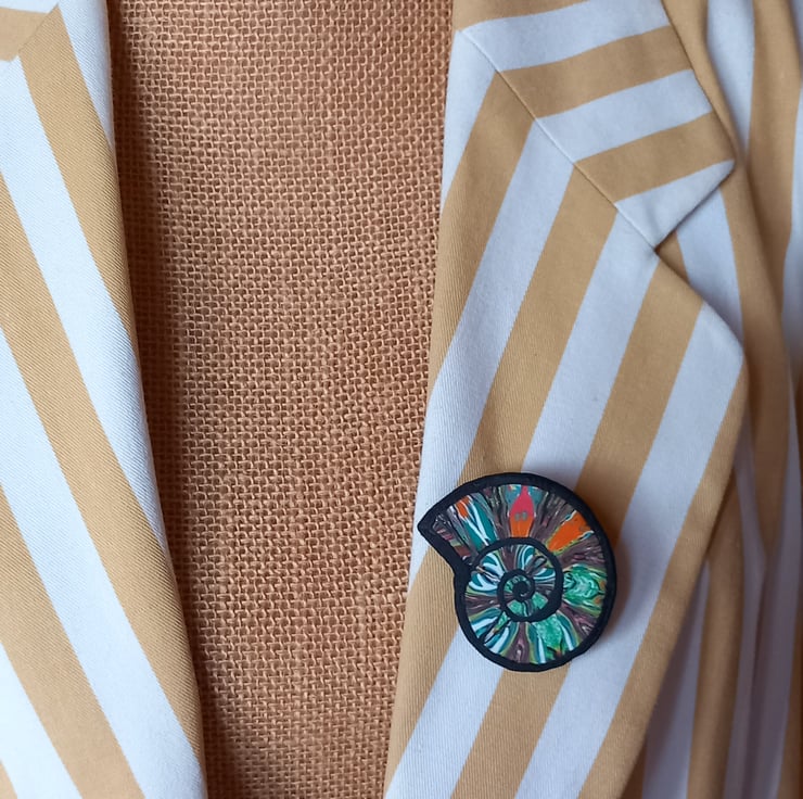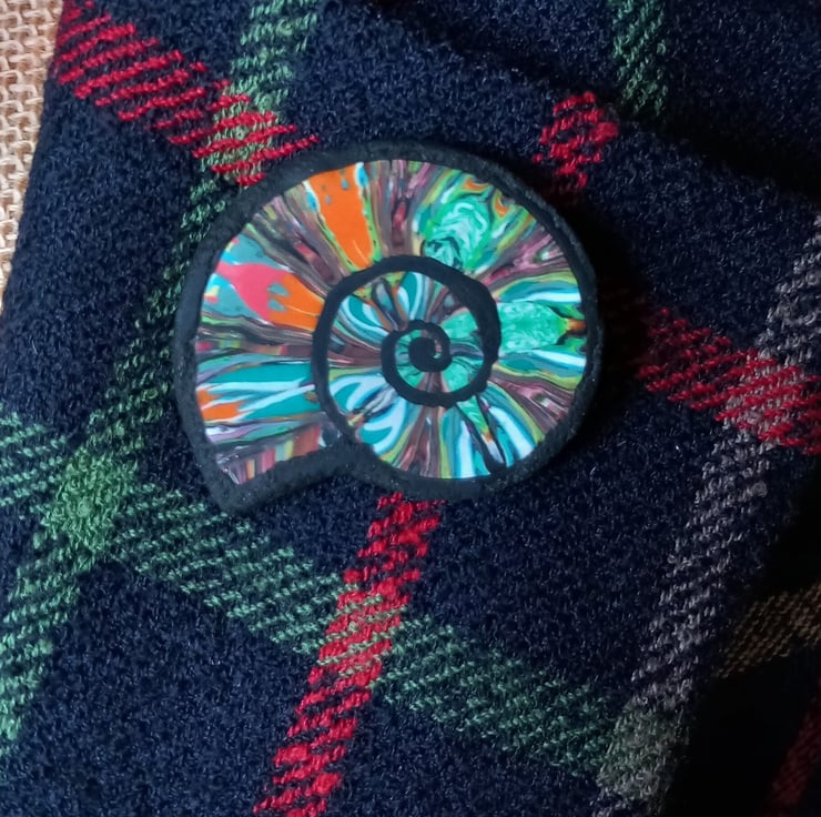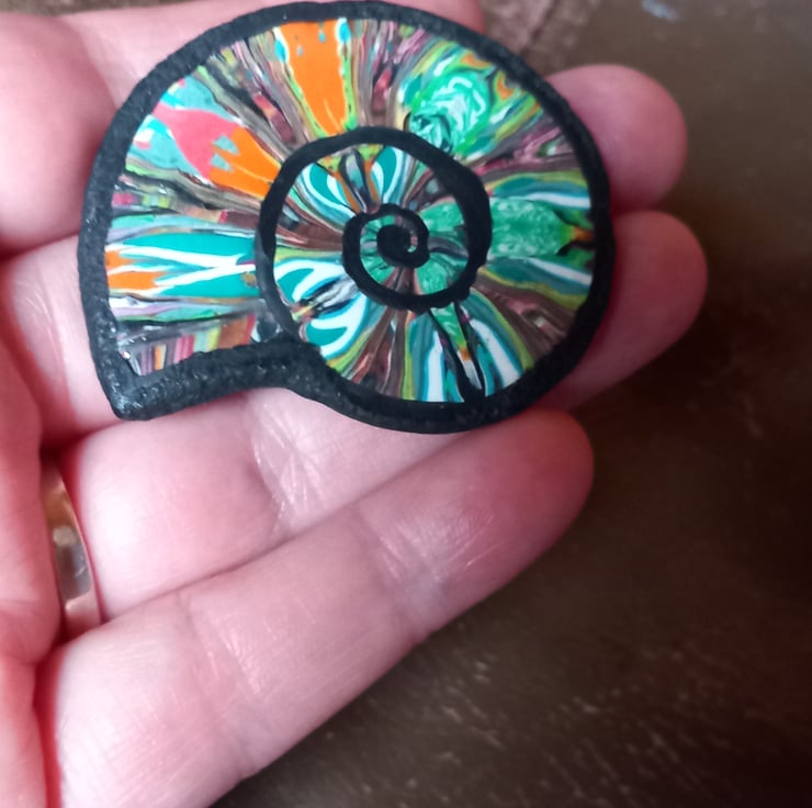 A beautiful new design from Froosh Maroosh, spirals!! Inspired by the beach and the shells I collect, made with a polymer clay mix of green's, orange and brown on a black background.