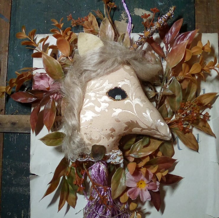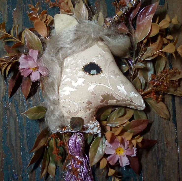 This piece is hand made using vintage textiles, I added glittering details, vintage trims and plant fibre hair