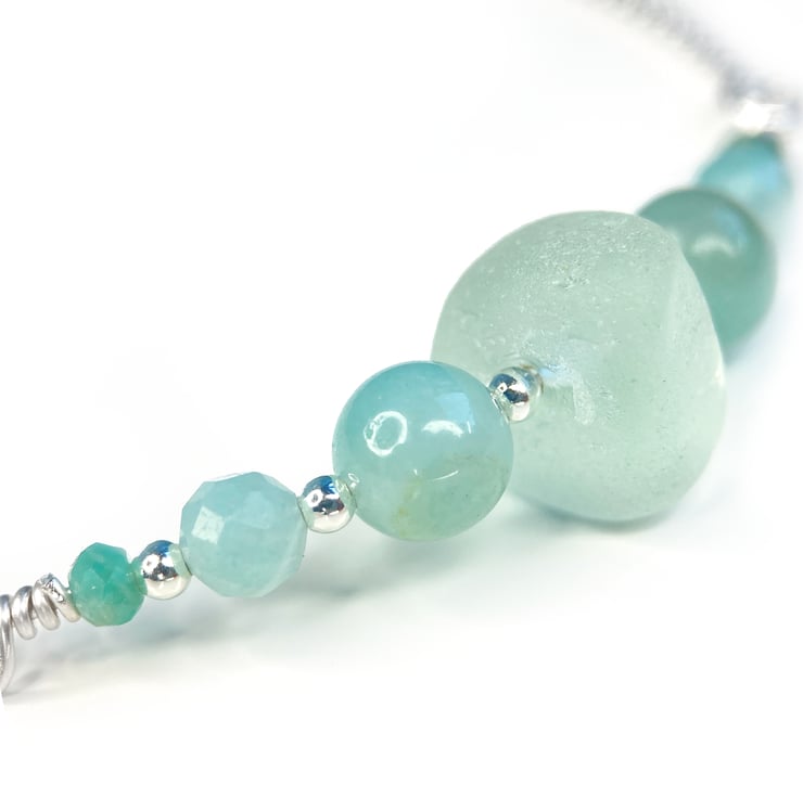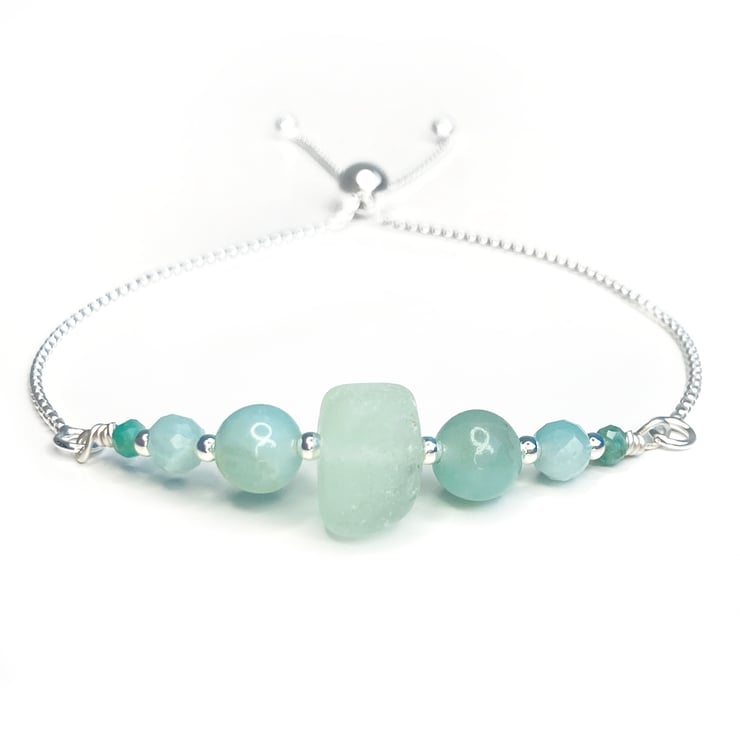 A delicate sea glass bracelet with a nugget of genuine green Scottish beach glass, Amazonite crystal and sterling silver beads, all presented on a sterling silver bracelet. The adjustable ball slider ensures a perfect fit on your wrist. This colour of sea glass is evocatively known as 'sea foam'. The beach glass has been worn smooth and frosted after decades of tumbling in the Scottish sea!