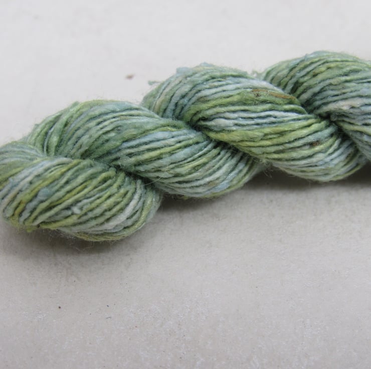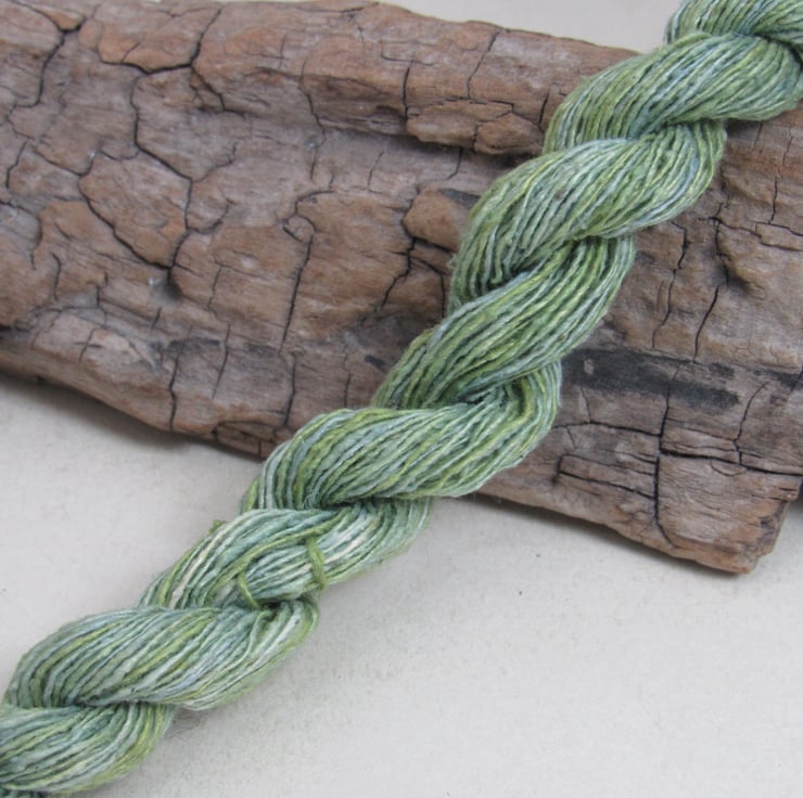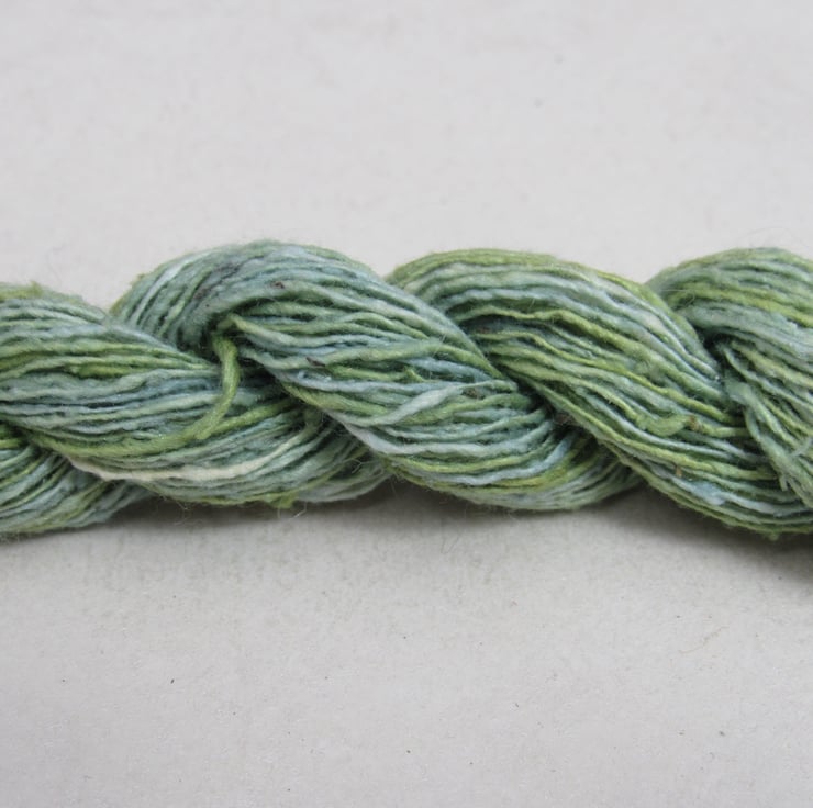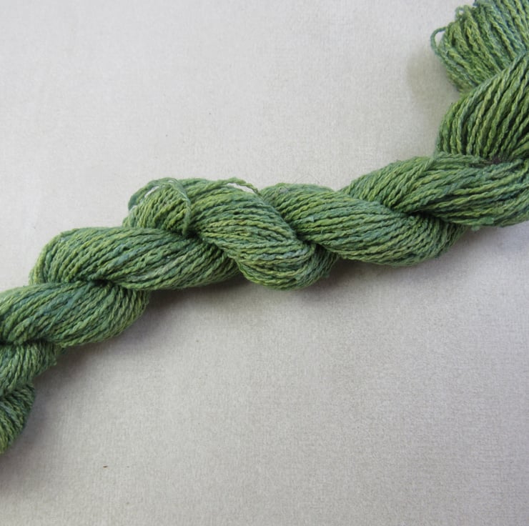 40m of lace-weight (172nm) pure spun bourette silk, dyed with natural weld and indigo dyes.