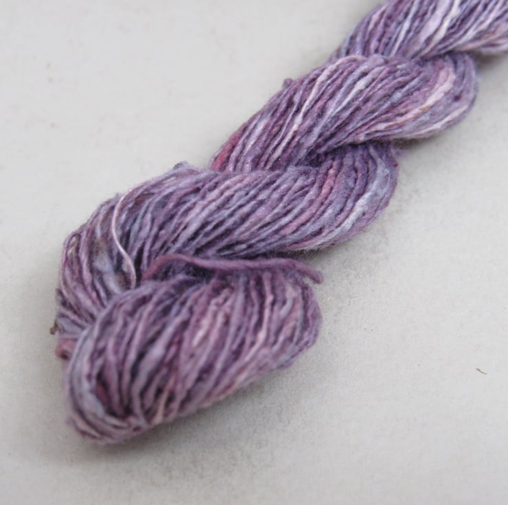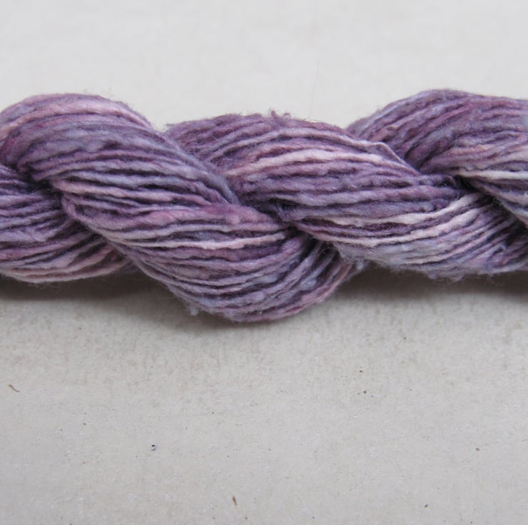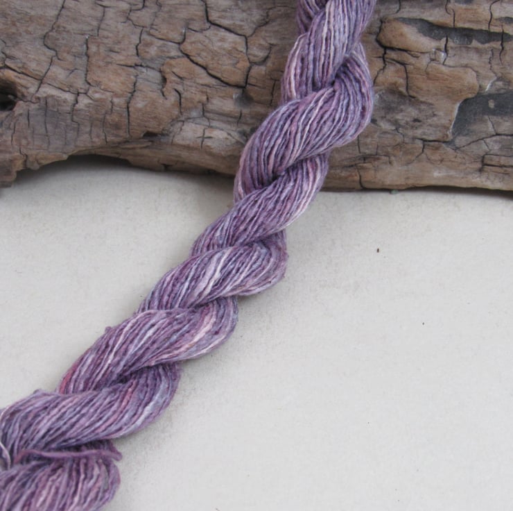 40m of lace-weight (172nm) pure spun bourette silk, dyed with natural cochineal and indigo dyes.