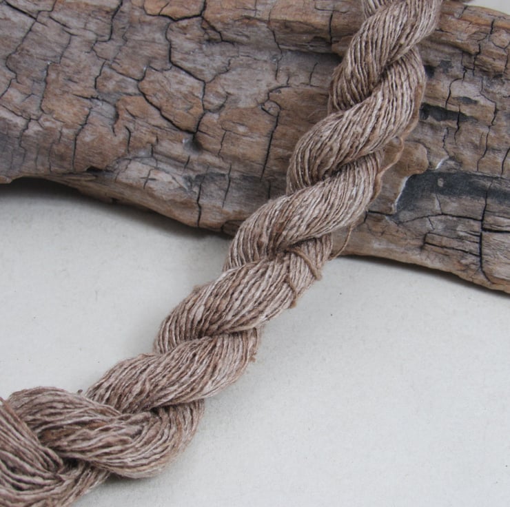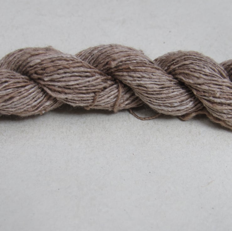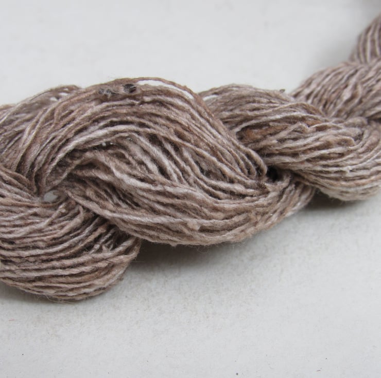 40m of lace-weight (172nm) pure spun bourette silk, dyed with natural walnut dyes.