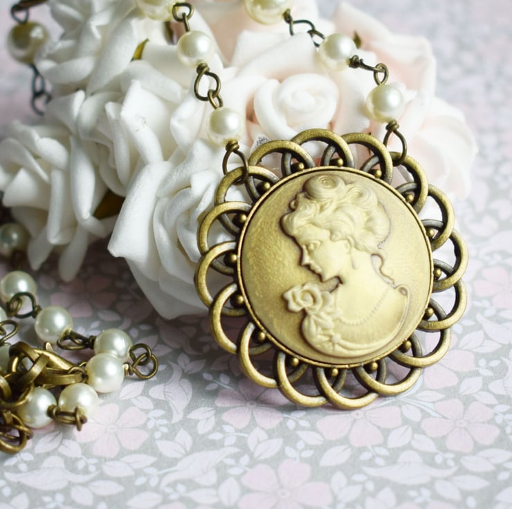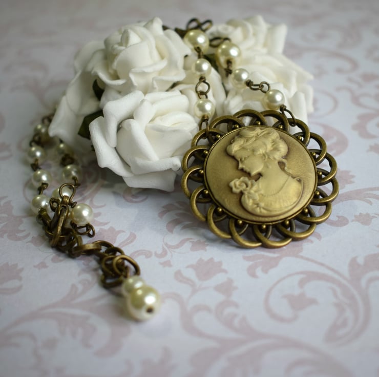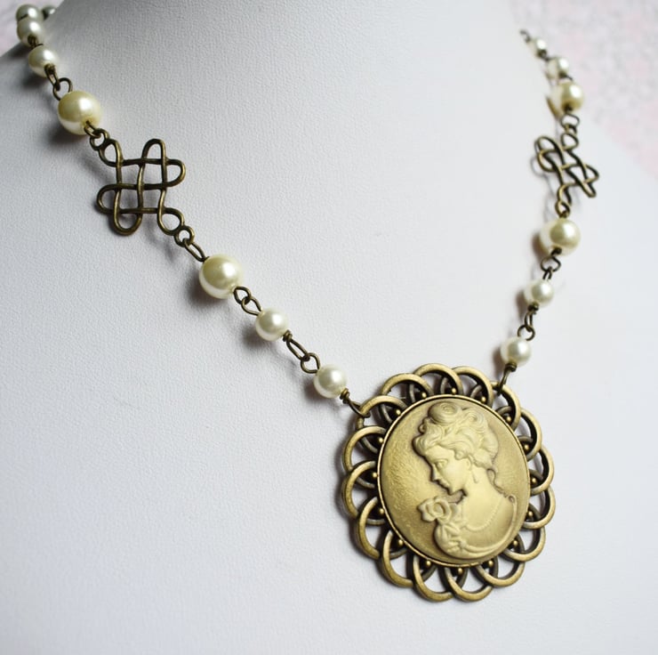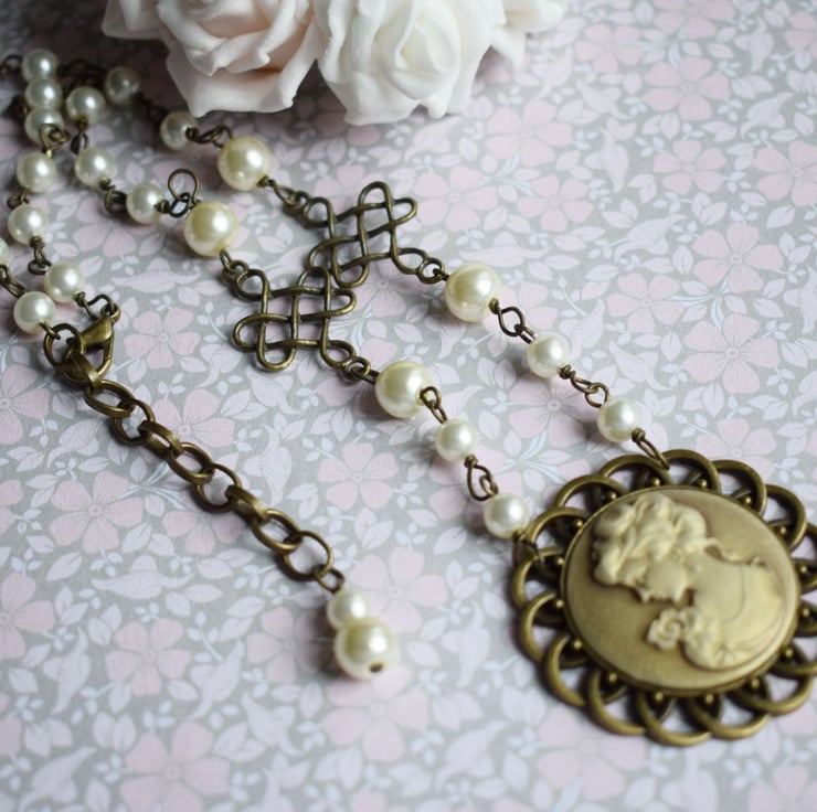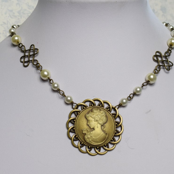 This lovely cameo necklace has a distinct vintage flair especially with the ivory glass pearl beads. The bronze coloured lady cameo sits in a bronze pendant and hangs from a chain made with glass pearl beads of two sizes. Just at each side there is also a little knot connector. This pretty necklace fastens with a lobster claw clasp and, as there is an extender chain, can be worn between 18 and 20 inches with the chain finished with a little charm made with 2 more of the glass pearls.